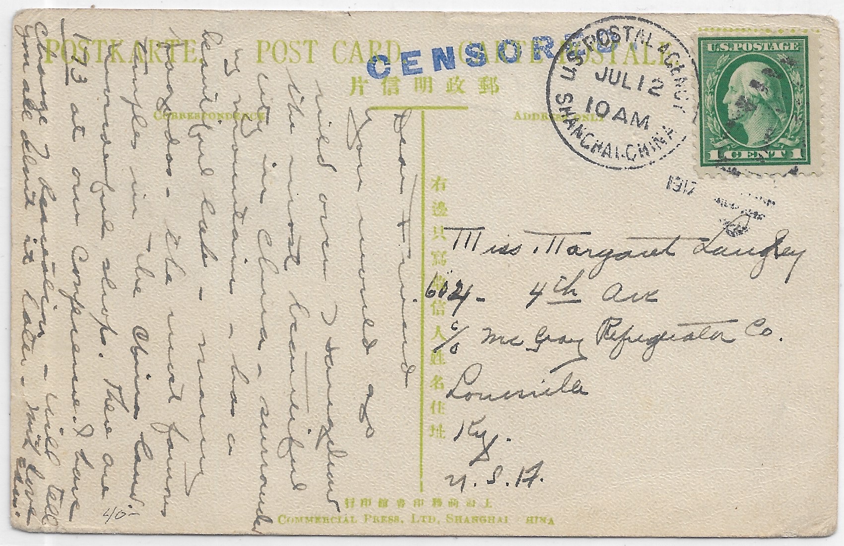 1918 U.S. Postal Agency, Shanghai, China to Louisville, KY Censored.