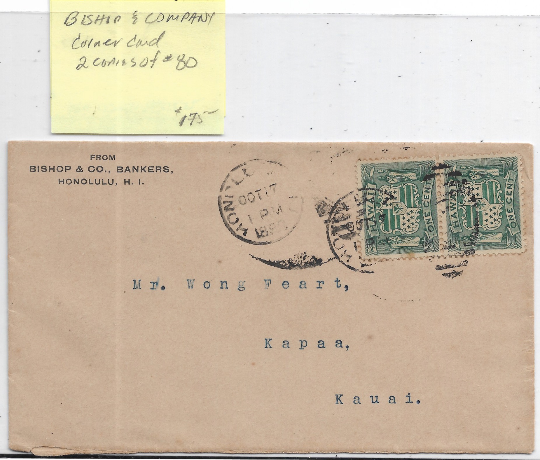 1898 Honolulu, Oahu to Kapaa, Kauai Bishop & Co corner card.Price: $175.00