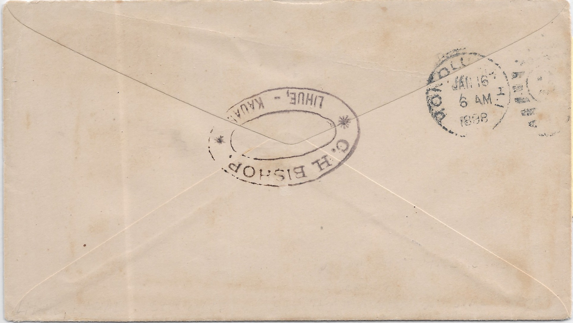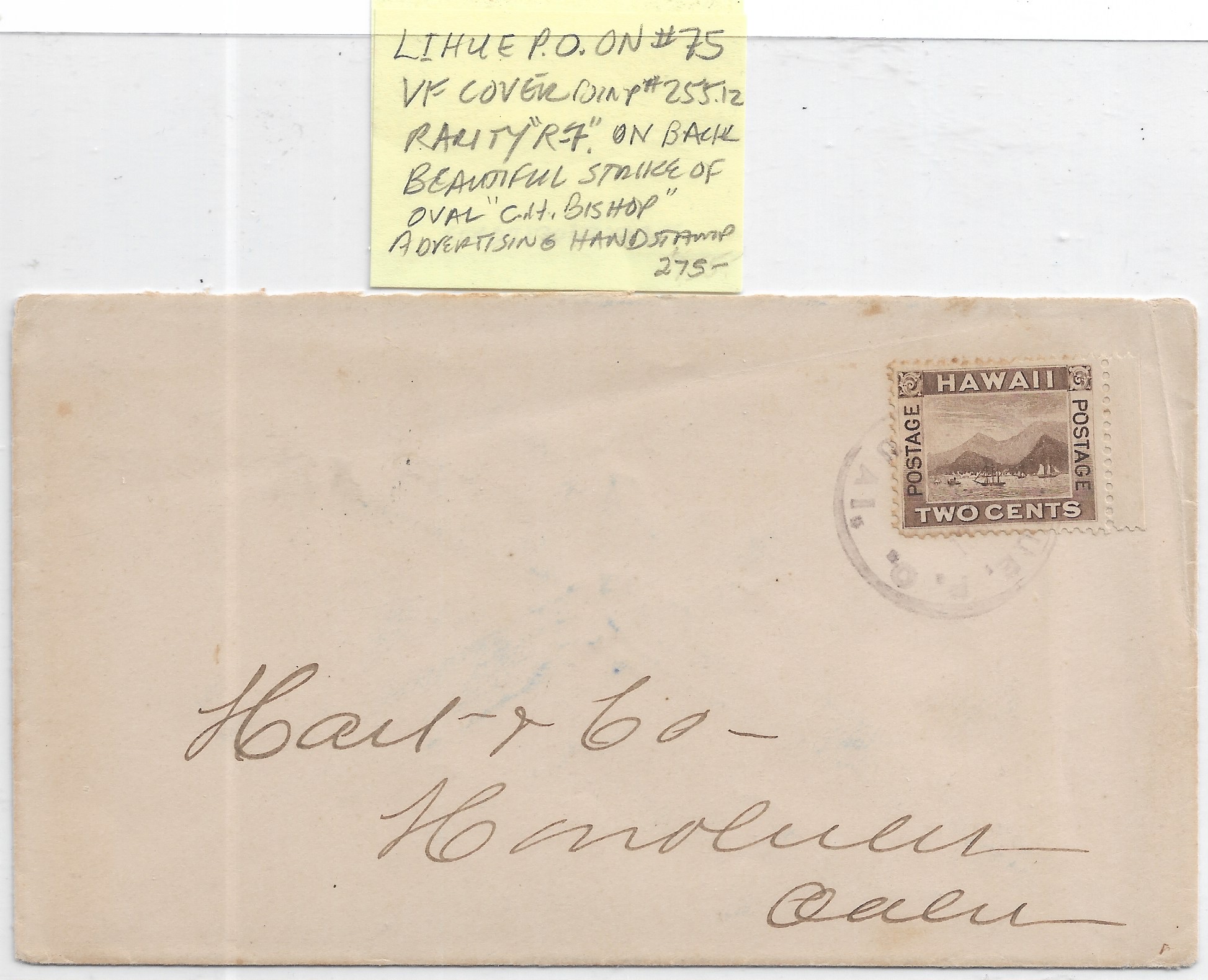 1898 Lihue, Kauai to Honolulu, Hawaii C.H. Bishop Advertising H/S on reverse. back stamped Honolulu.Price: $275.00