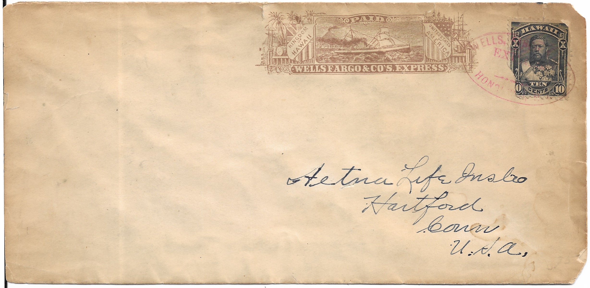 18xx Wells Fargo, Honolulu, Hi to Hartford, Ct. Cover and stamp is damaged. Cat is $6000.00.Price: $450.00