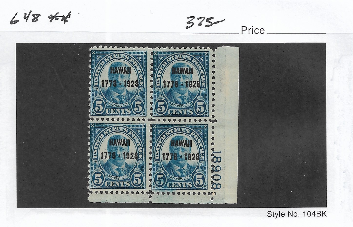 | 5c Hawaii Overprint, Sc #648, MNH Plate Block. | Price: $250.00