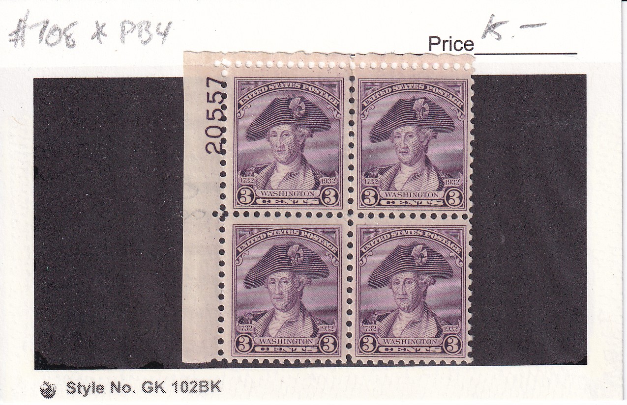 | 3c Washington Plate Block/4, Sc #708, MH. | Price: $7.00