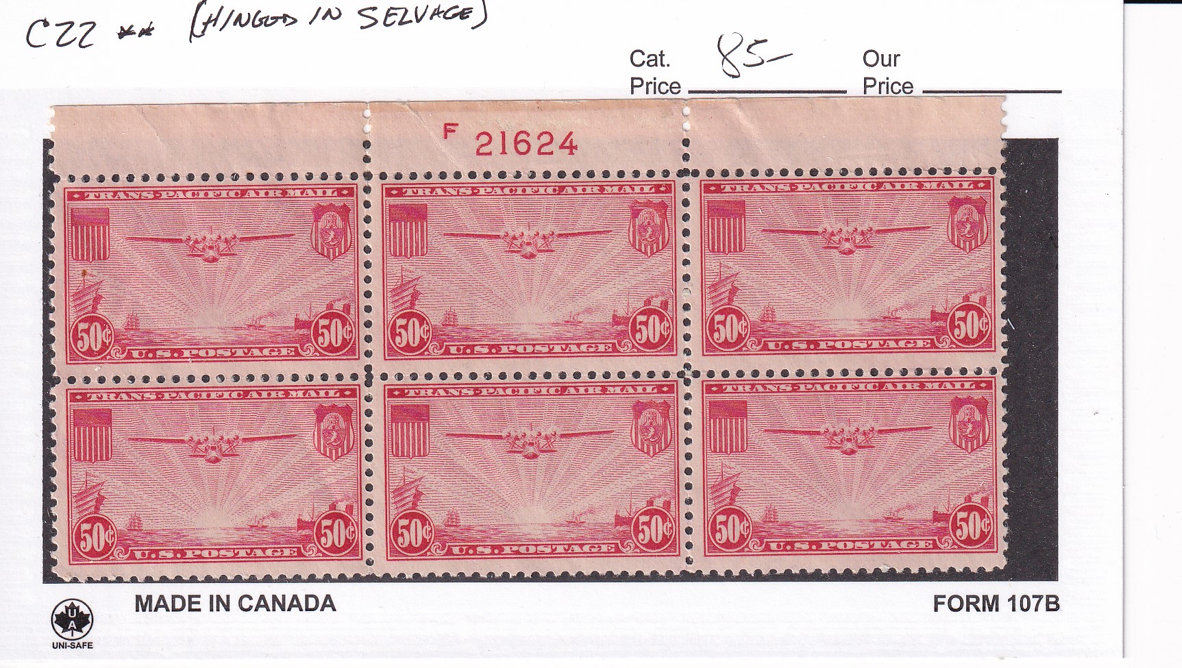 | 50c Clipper Plate Block/6, Sc #C22, MNH (hinged in selvage). | Price: $45.00