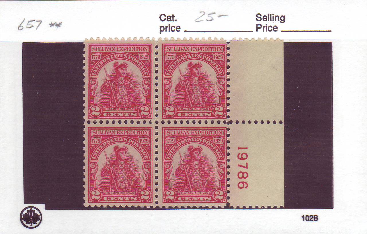 | 2c Sullivan Expedition Block/4 w/Plate Number, Scott #657, MNH. | Price: $18.00