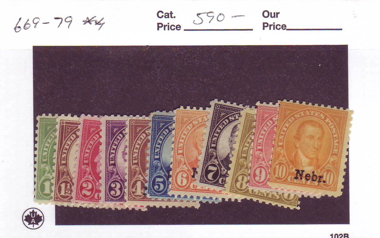 | 1c-10c Nebraska Overprint set, Scott #669-679, MNH. | Price: $410.00