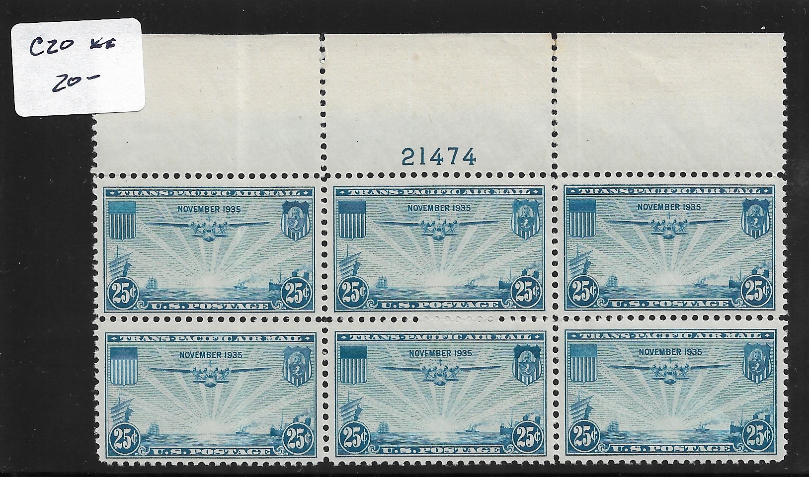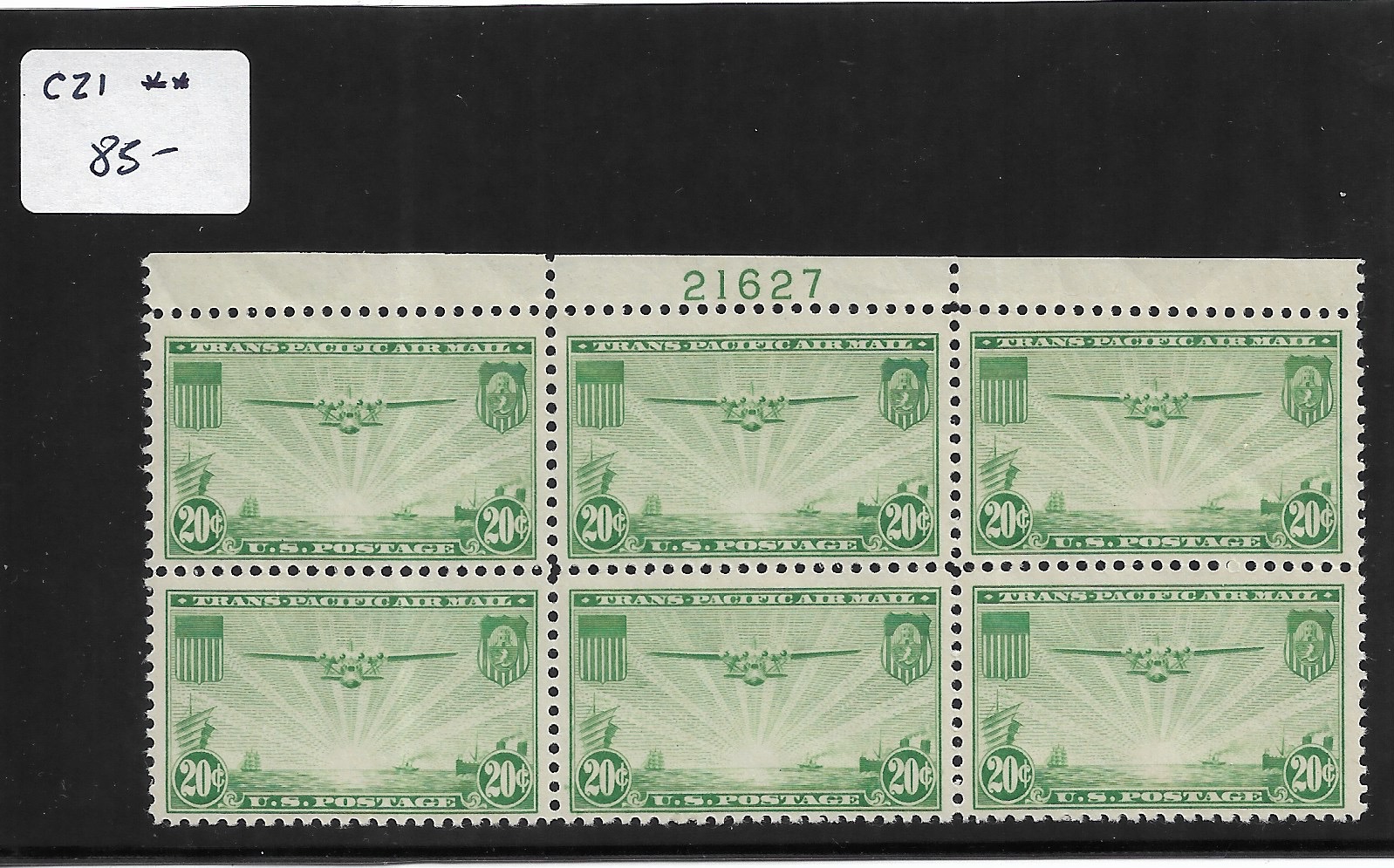 | 20c Clipper, Sc # C21, MNH Plate Block. | Price: $65.00