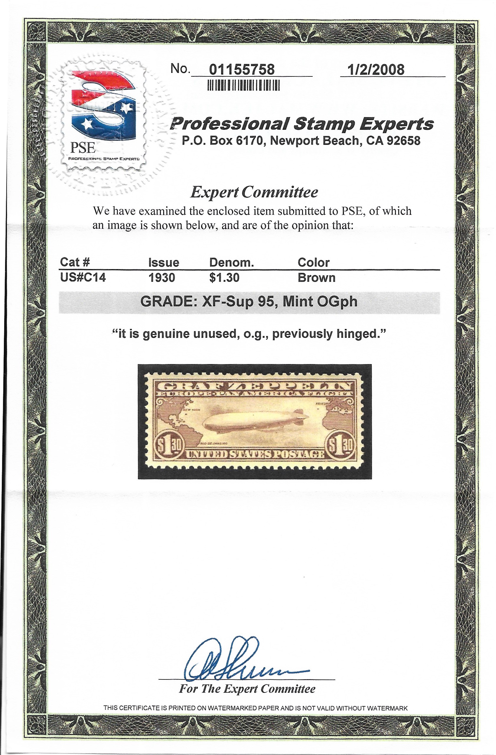 | $1.30 Zeppelin, Sc # C14, MH, Sup/95 W/PSE Cert. | Price: $400.00