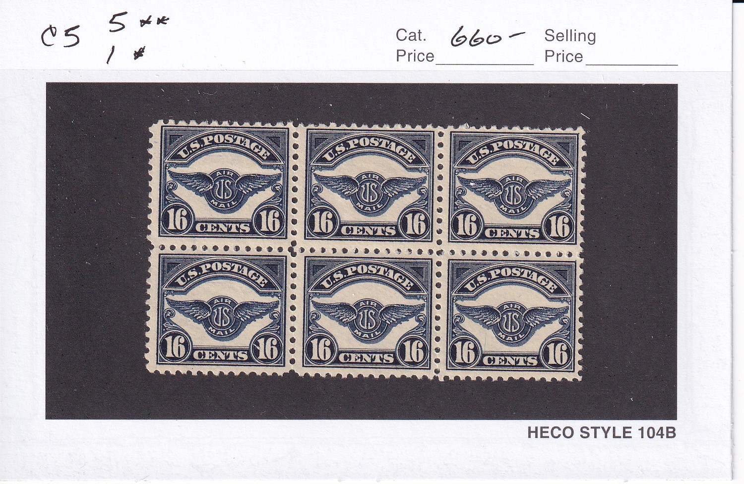 | 16c Airmail, Sc #C5, Blk/6, (5 MNH, 1 MH). | Price: $500.00