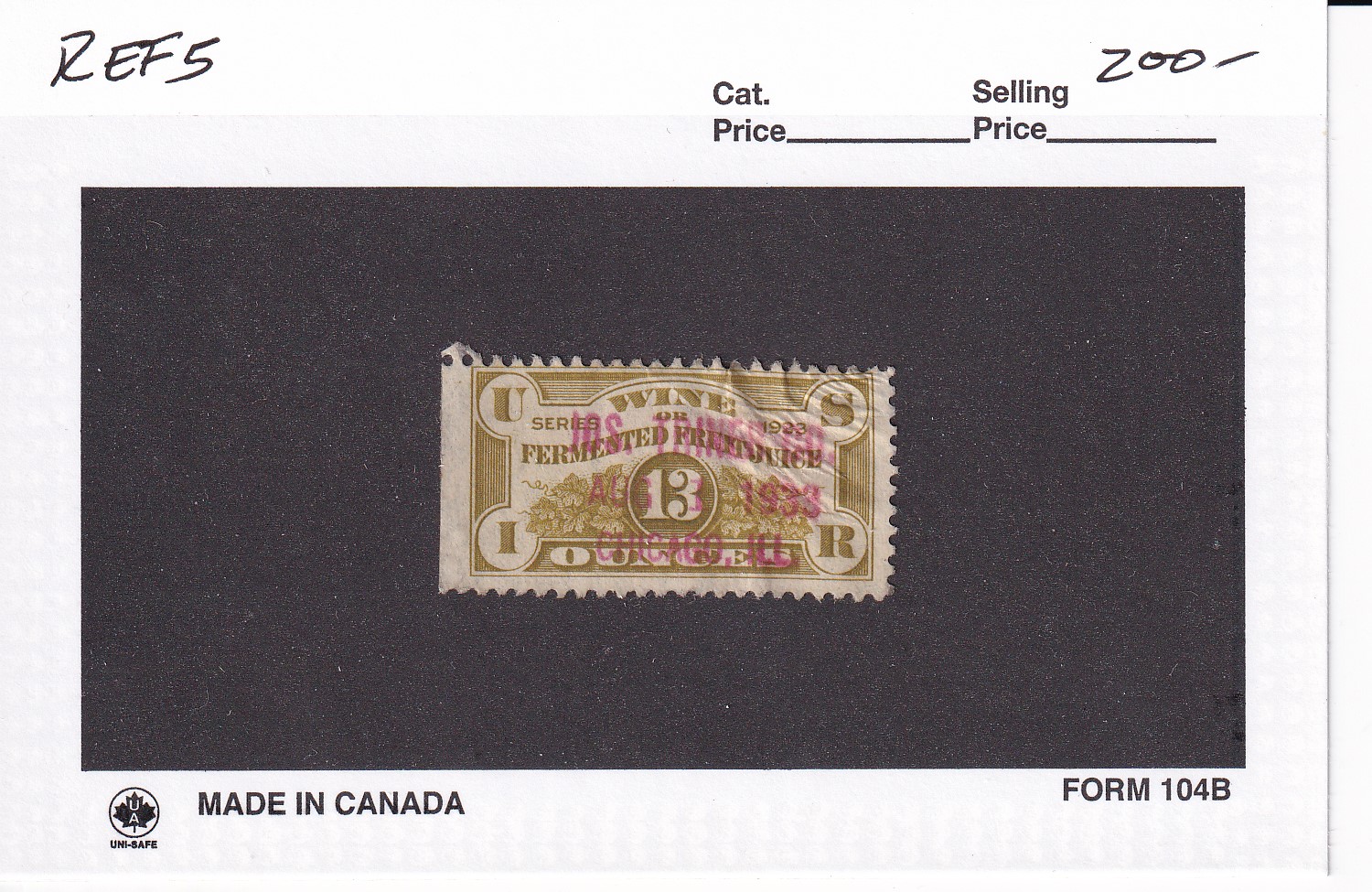 | 13 oz Fermented Fruit Juice Tax Stamp, SC #REF5, used. | Price: $200.00