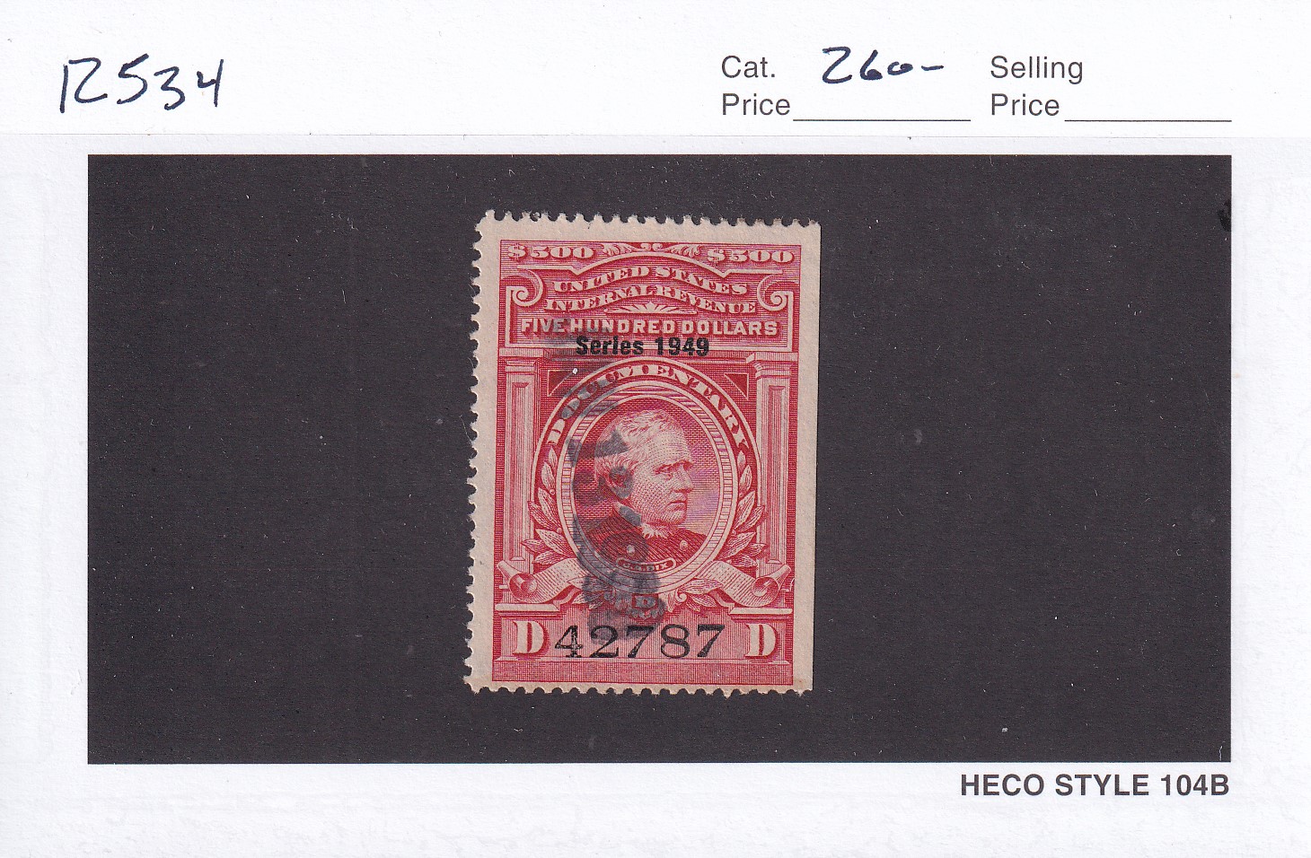 | $500 1949 Documentary tax Stamp, Sc # R534, used. | Price: $195.00