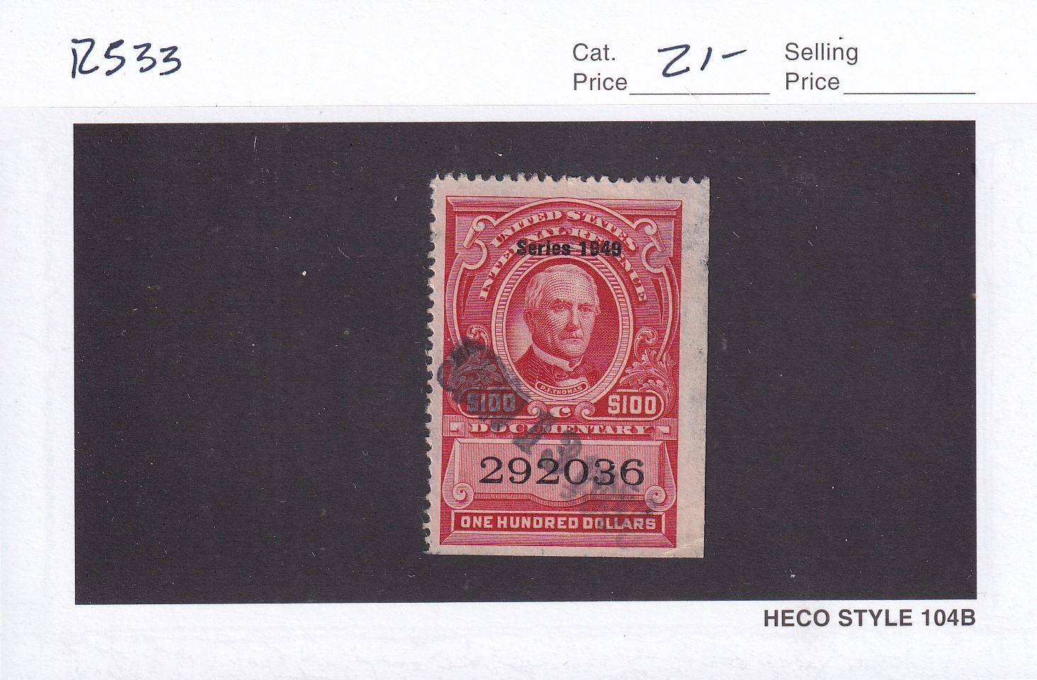 | $100 1949 Documentary tax Stamp, Sc # R533, used. | Price: $15.00