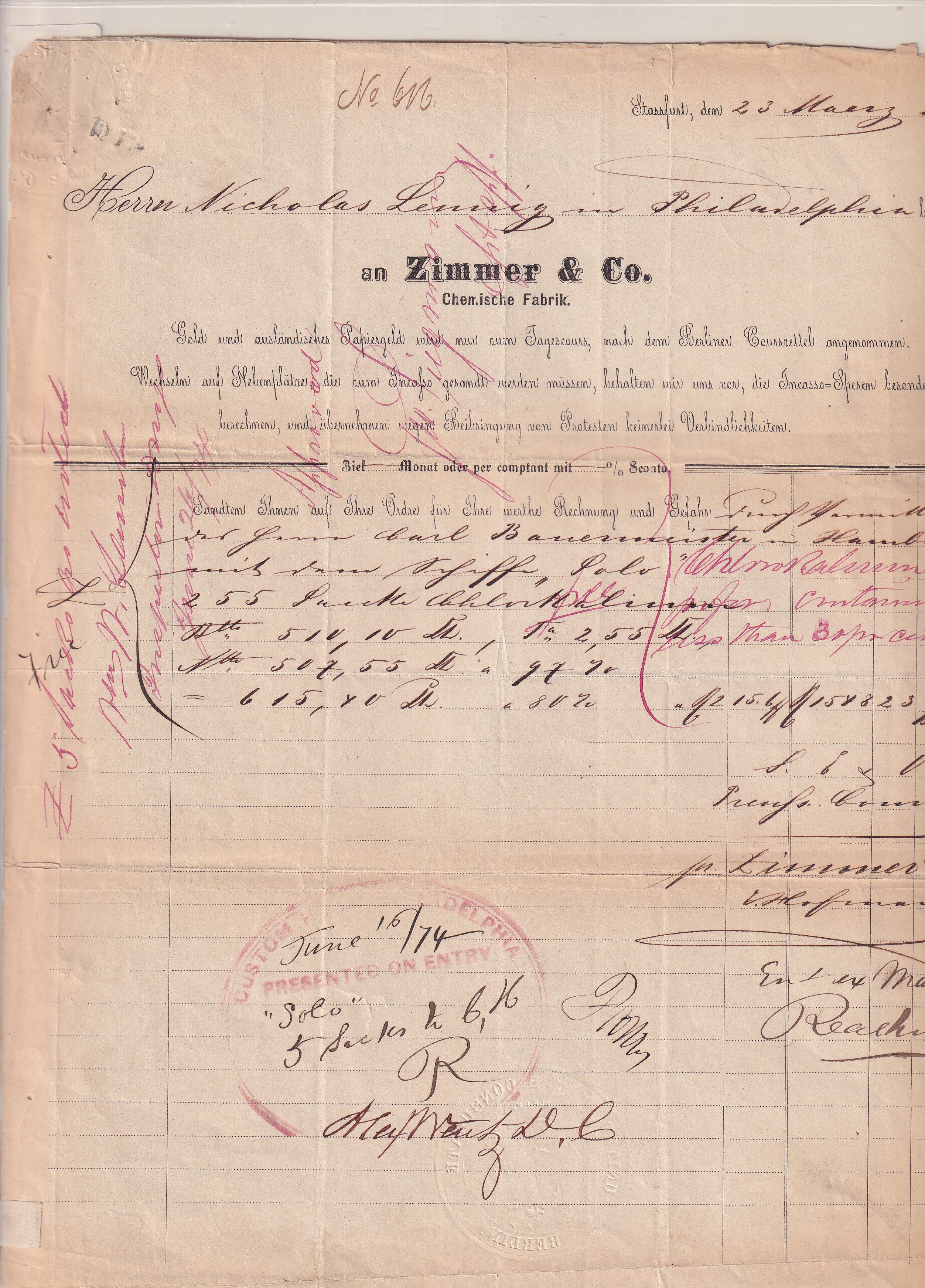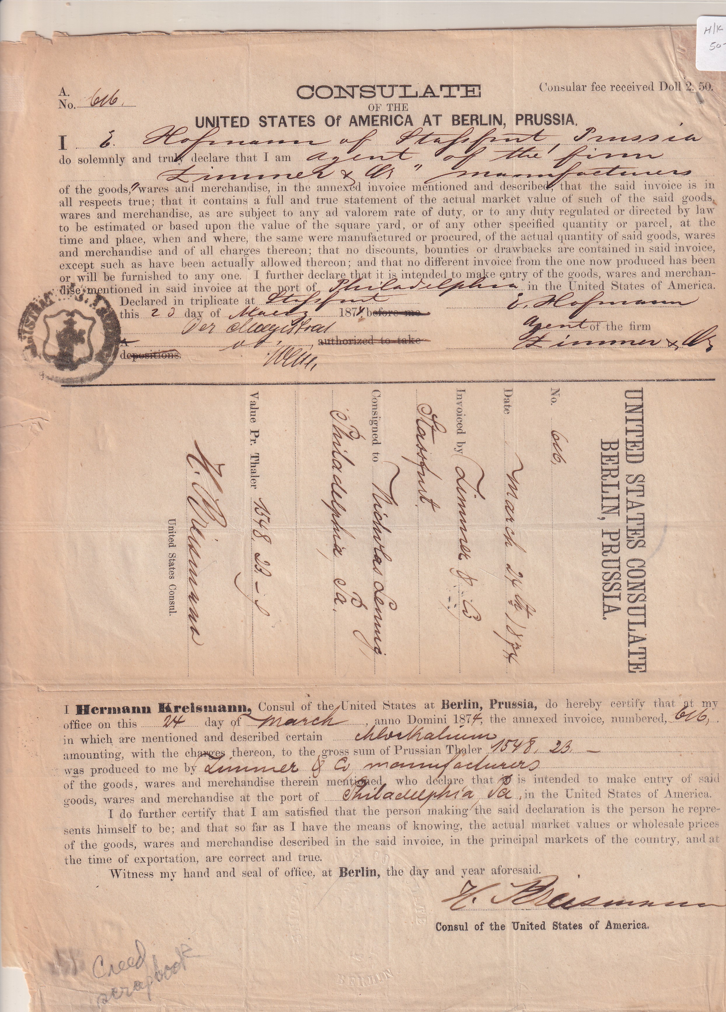 | 1874 U.S. Consulate, Berlin Prussia Merchant Document for Import into Port of Philadelphia w/Consulate Stamp. | Price: $50.00