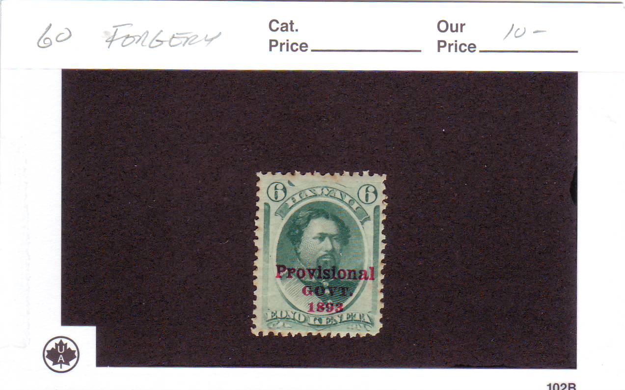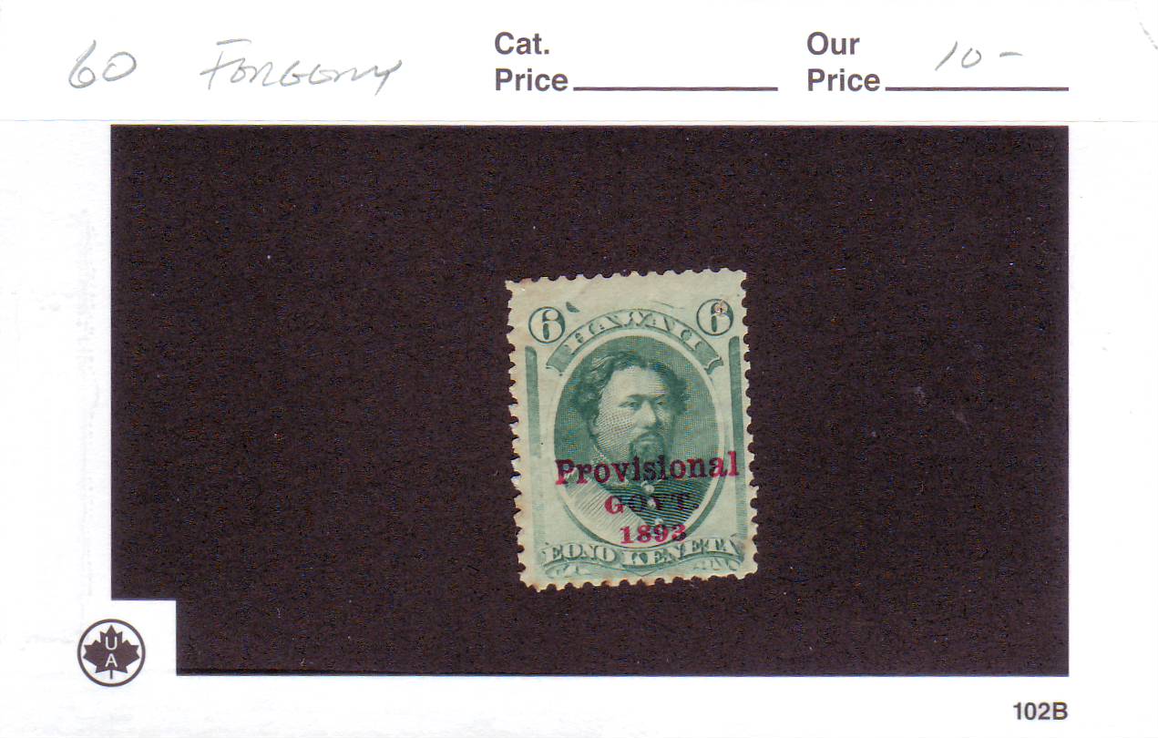 | Hawaii: Scott #60 6c w/Red Provisional Overprint, FORGERY. This overprint is a FORGERY. | Price: $10.00