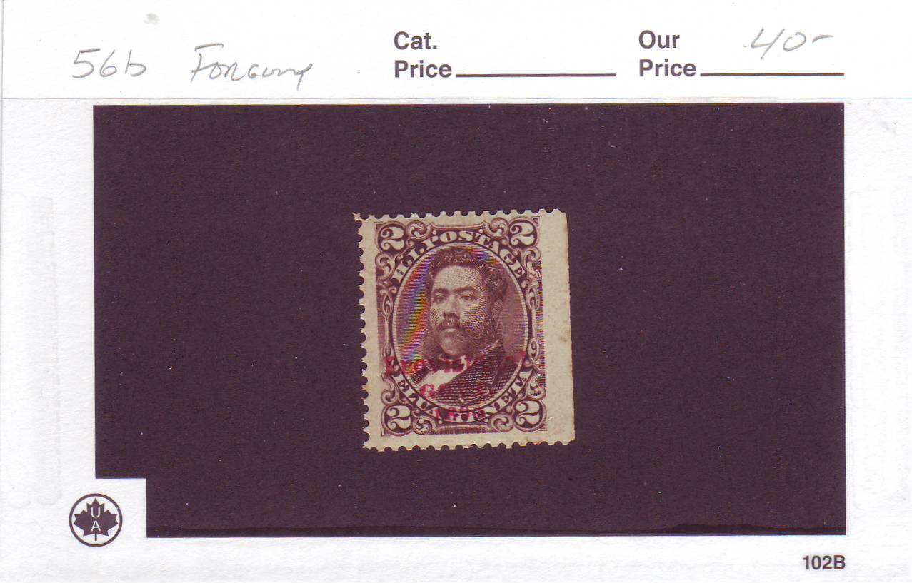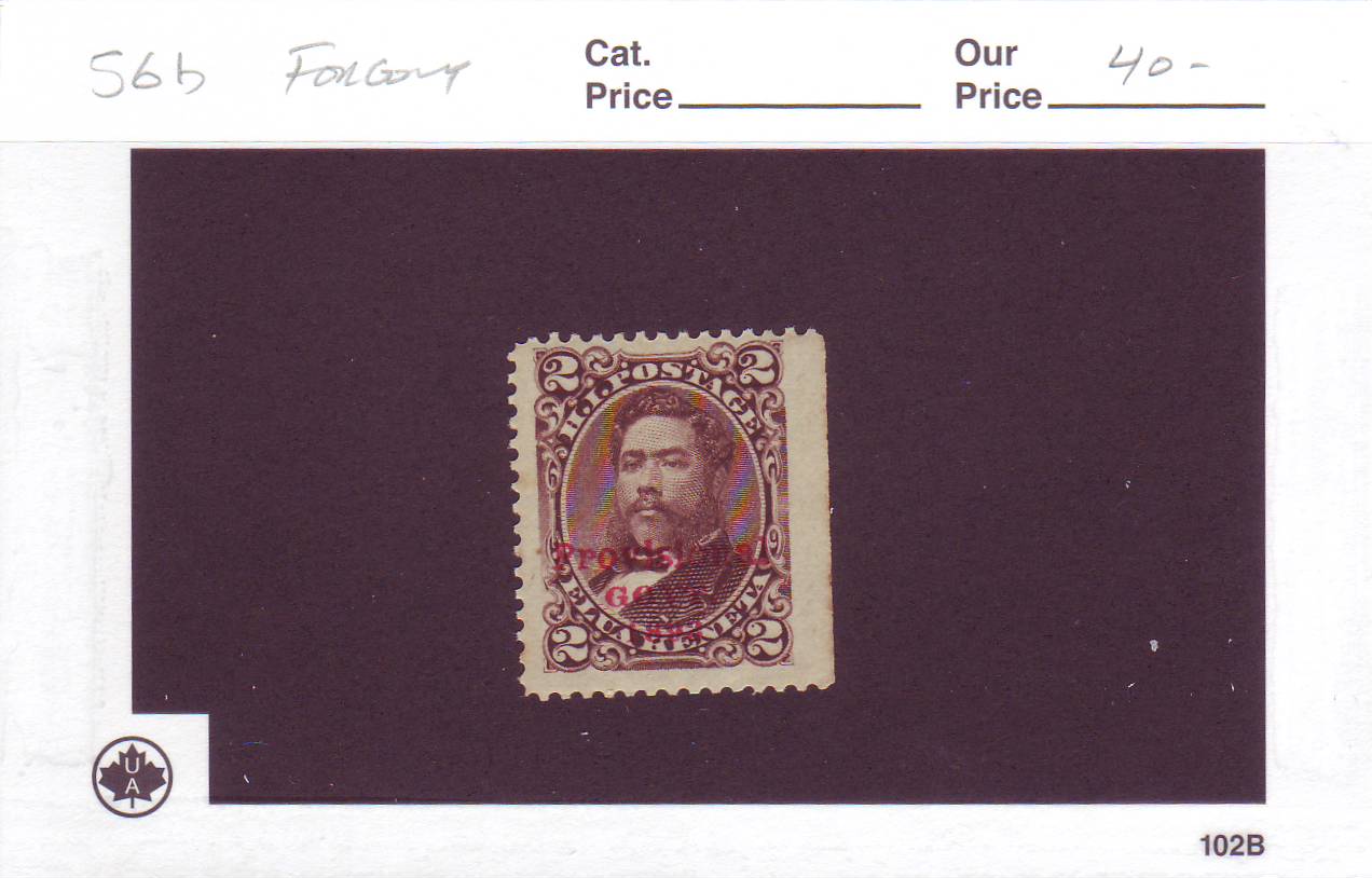 | Hawaii: Scott #56b 2c Brown w/Red Provisional Overprint, Missing Period, FORGERY. NOTE ***This overprint is a FORGERY***. | Price: $40.00