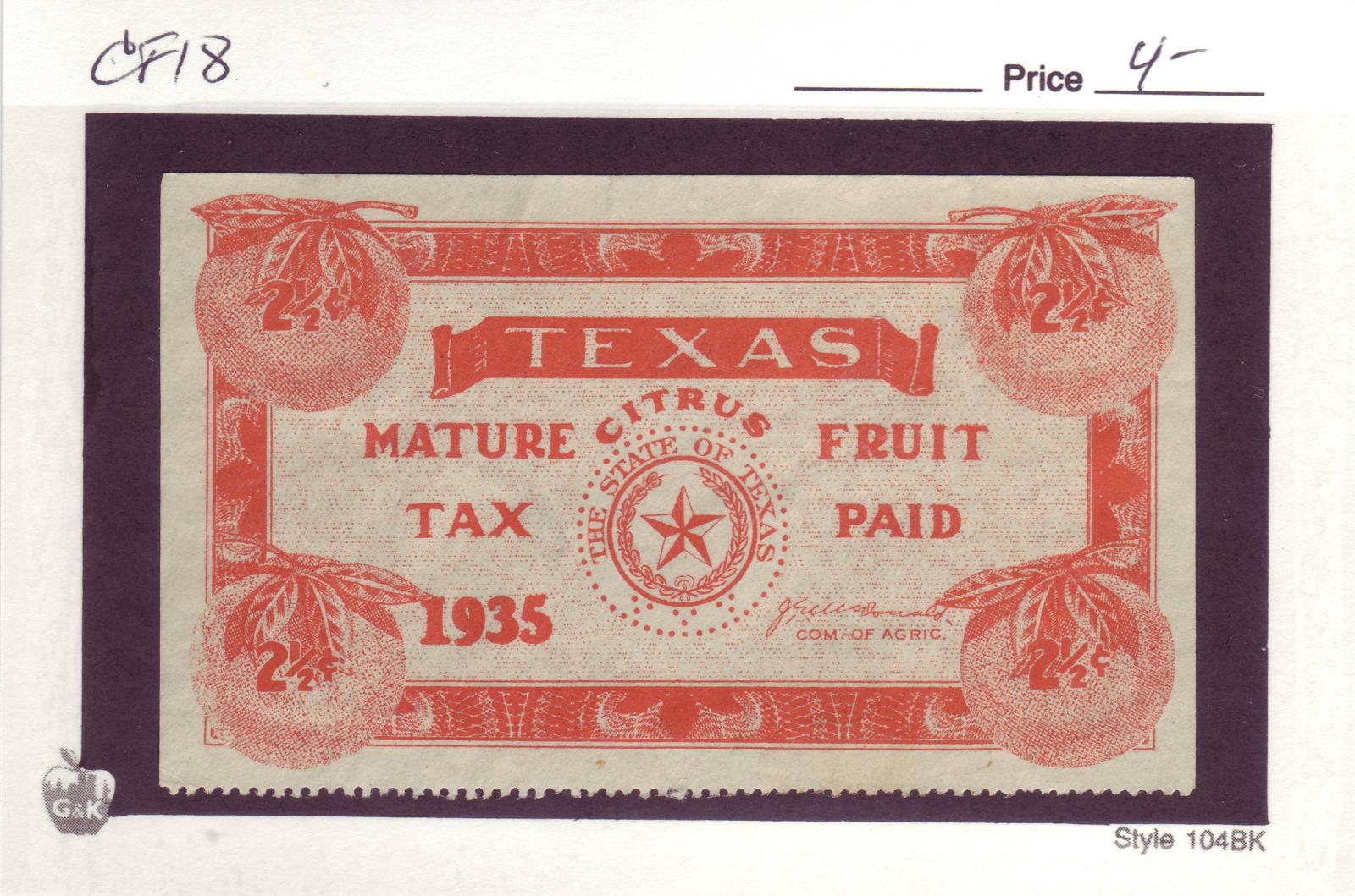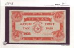 | Texas: 1935 2 1/2c Mature Fruit Tax Stamp, #CF18. | Price: $4.00