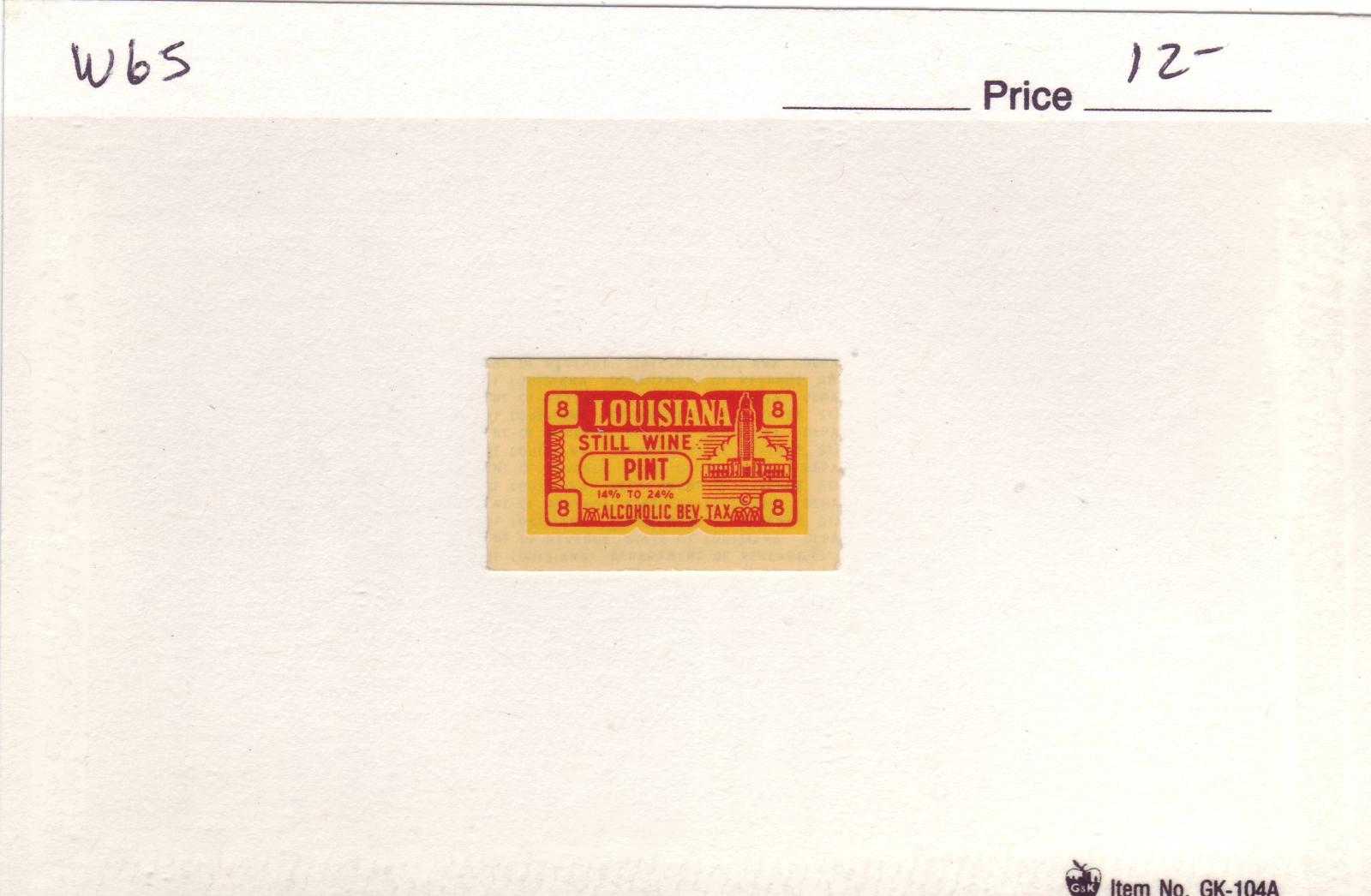 | Louisiana: 1 pint Still Wine Tax Stamp, #W65. | Price: $12.00