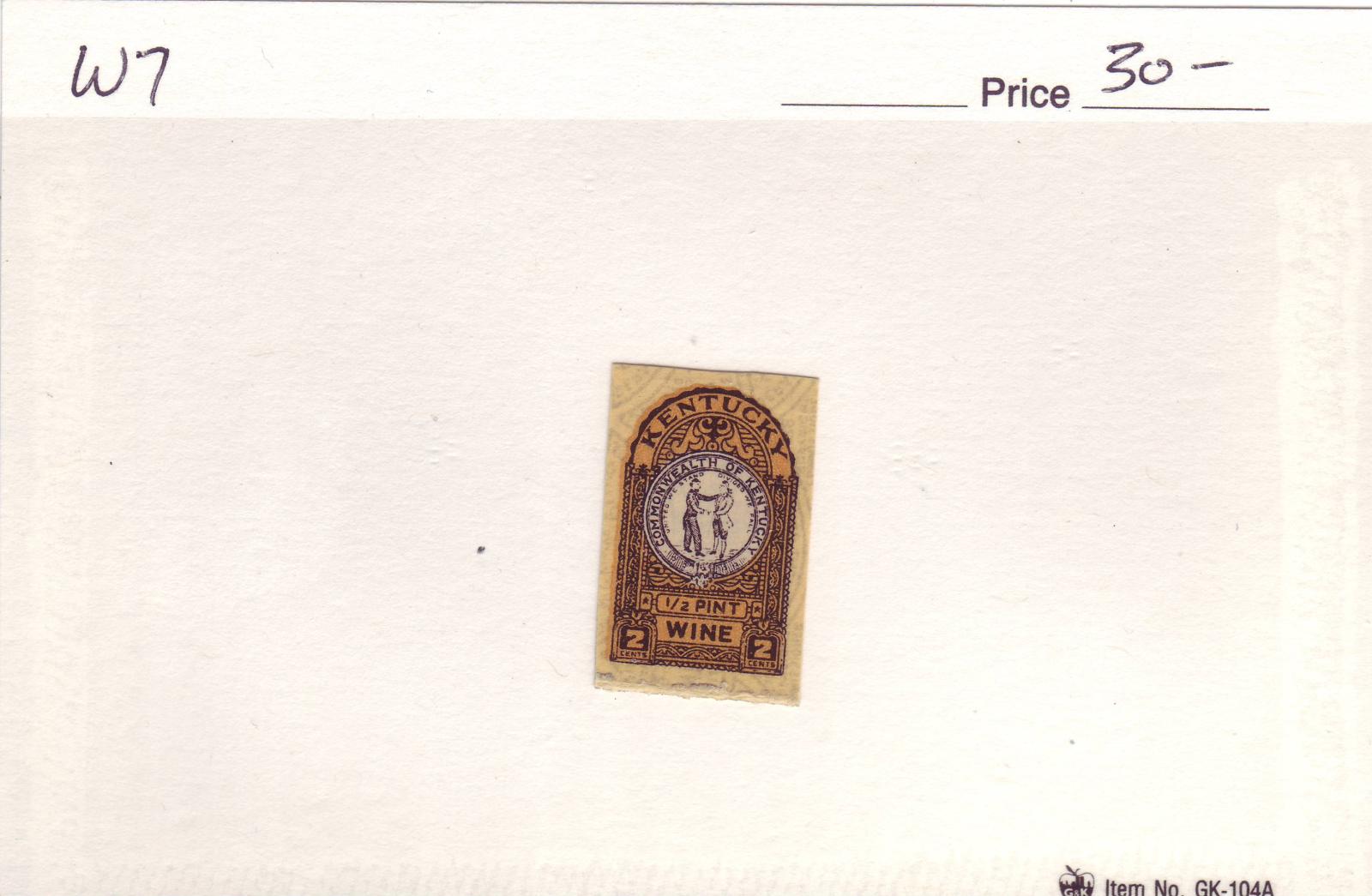 | Kentucky: 2c Wine Tax Stamp, #W7. | Price: $30.00