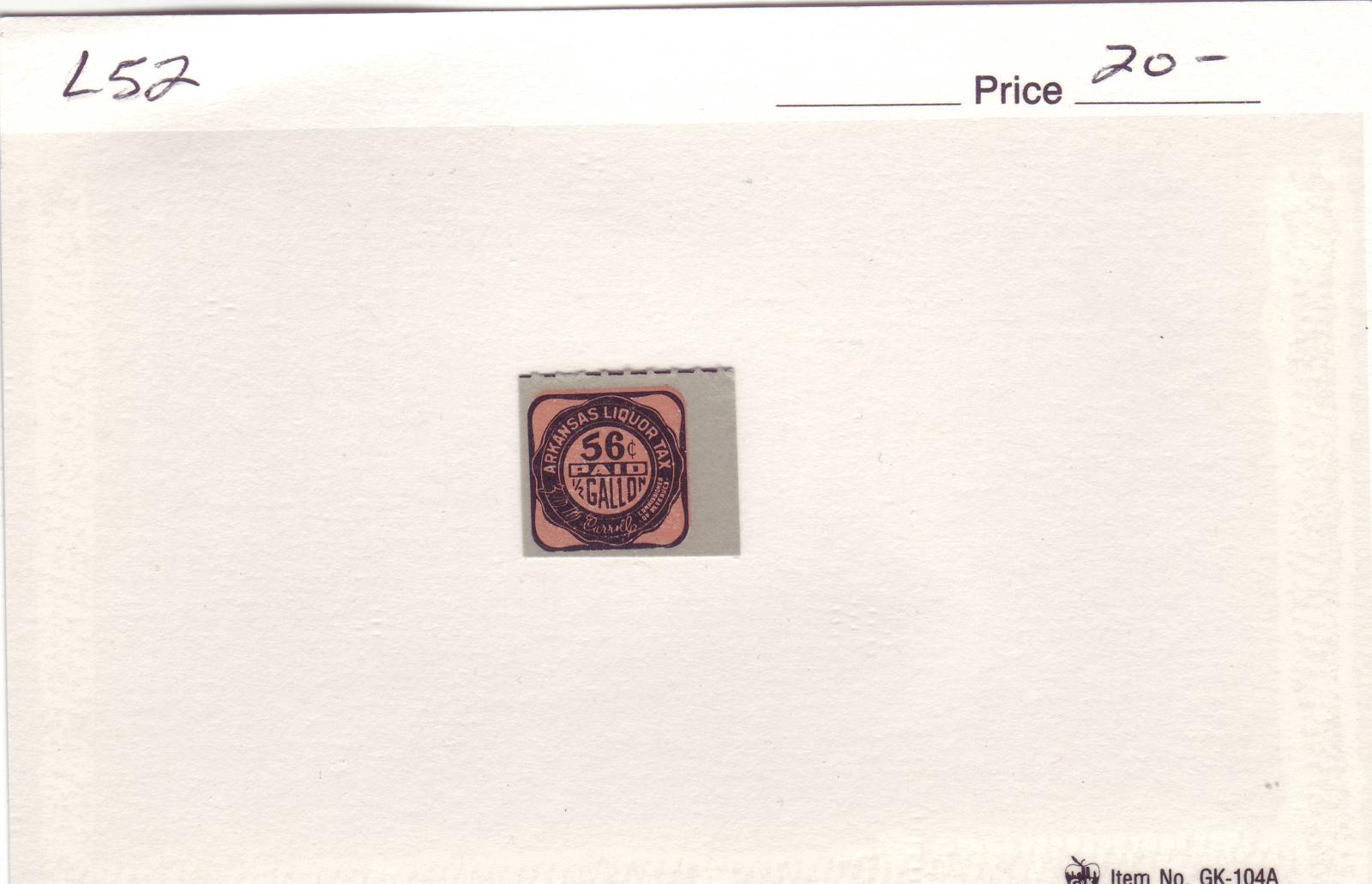| Arkansas: 56c Liquor Tax Stamp, #L52. | Price: $20.00