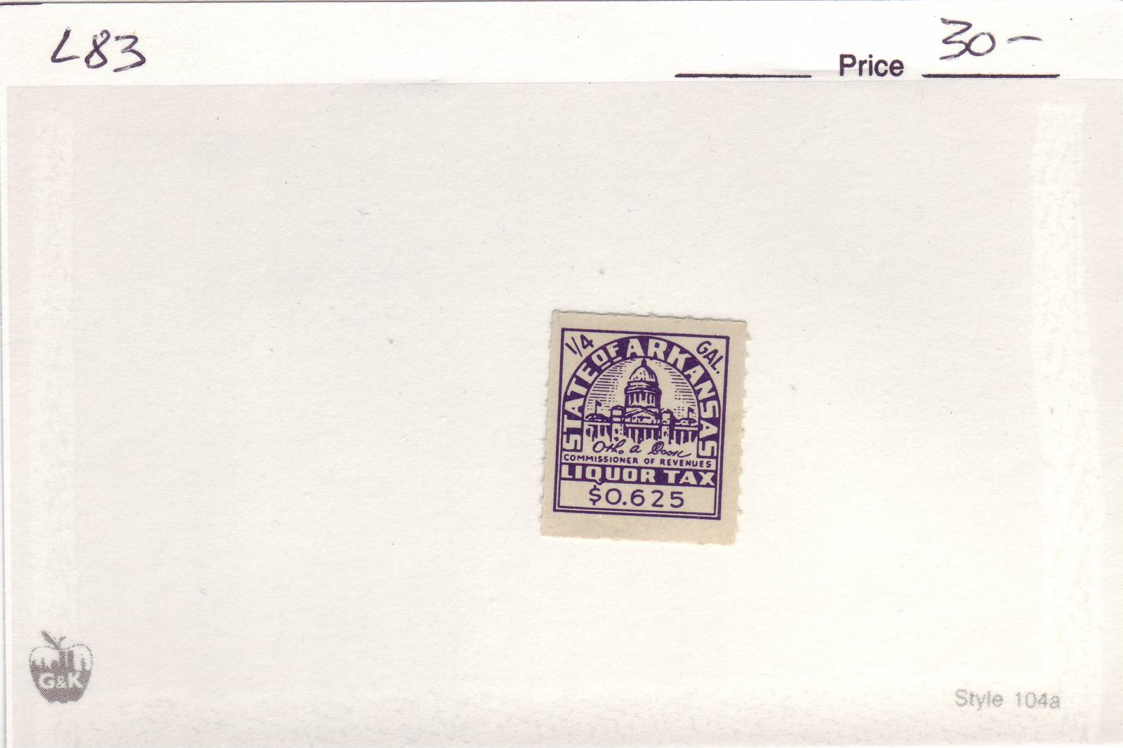 | Arkansas: .625c Liquor Tax Stamp, #L83. | Price: $30.00