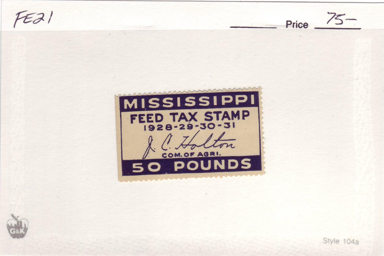 | Mississippi: 50lb Feed Tax Stamp, #FE21. | Price: $75.00