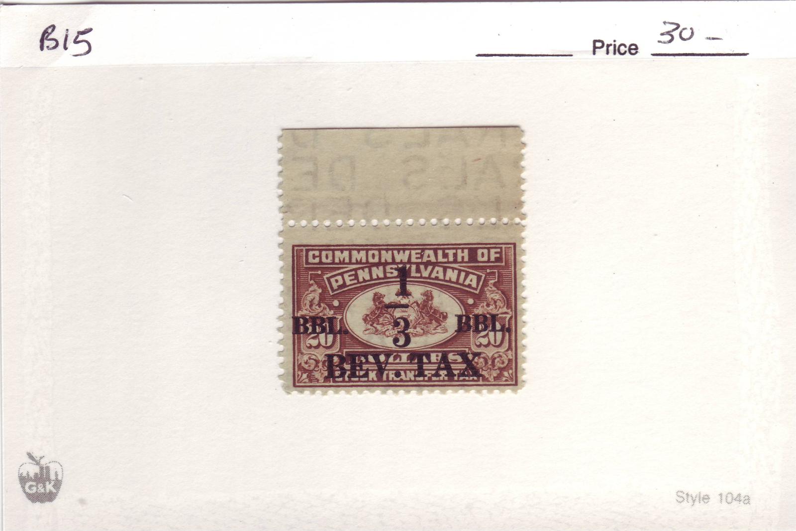 | Pennsylvania: 1/3 BBL Beer Tax Stamp, B15. | Price: $30.00