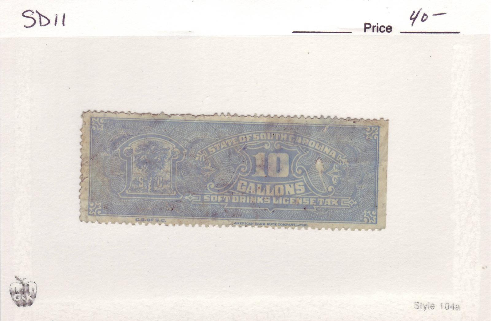 | South Carolina: 10 Gal Soda Tax Stamp, #SD11. | Price: $40.00