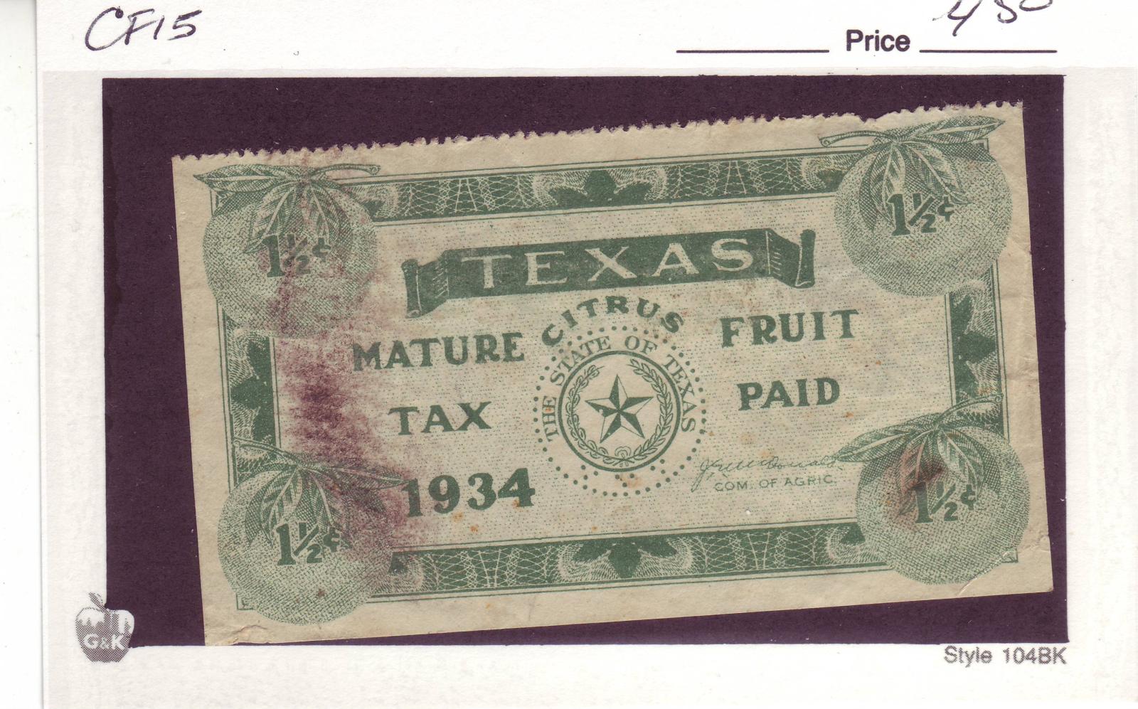 | Texas: 1934 1 1/2c Mature Fruit Tax Stamp, #CF15. | Price: $4.50