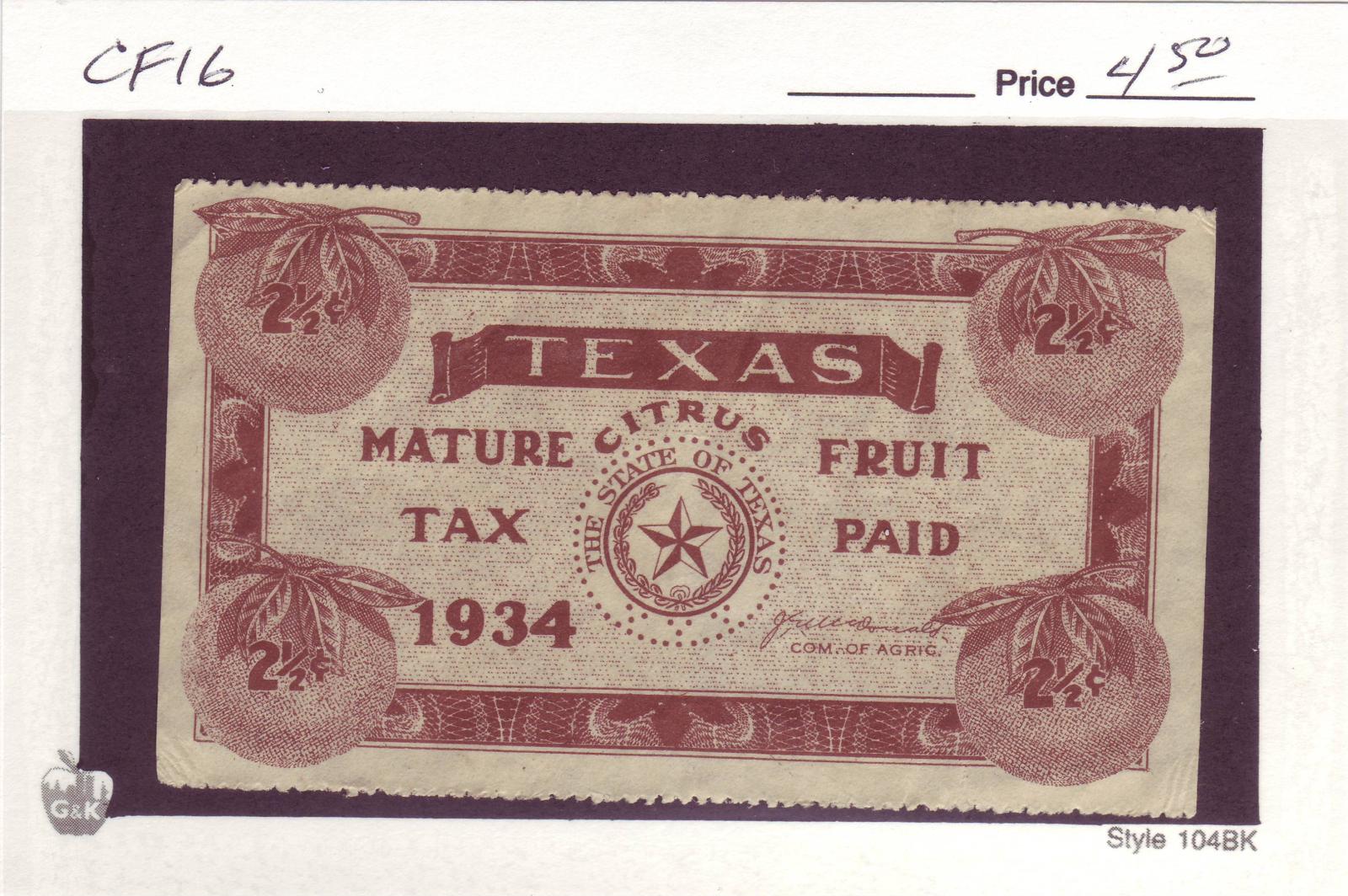 | Texas: 1934 2 1/2c Mature Fruit Tax Stamp, #CF16. | Price: $4.50
