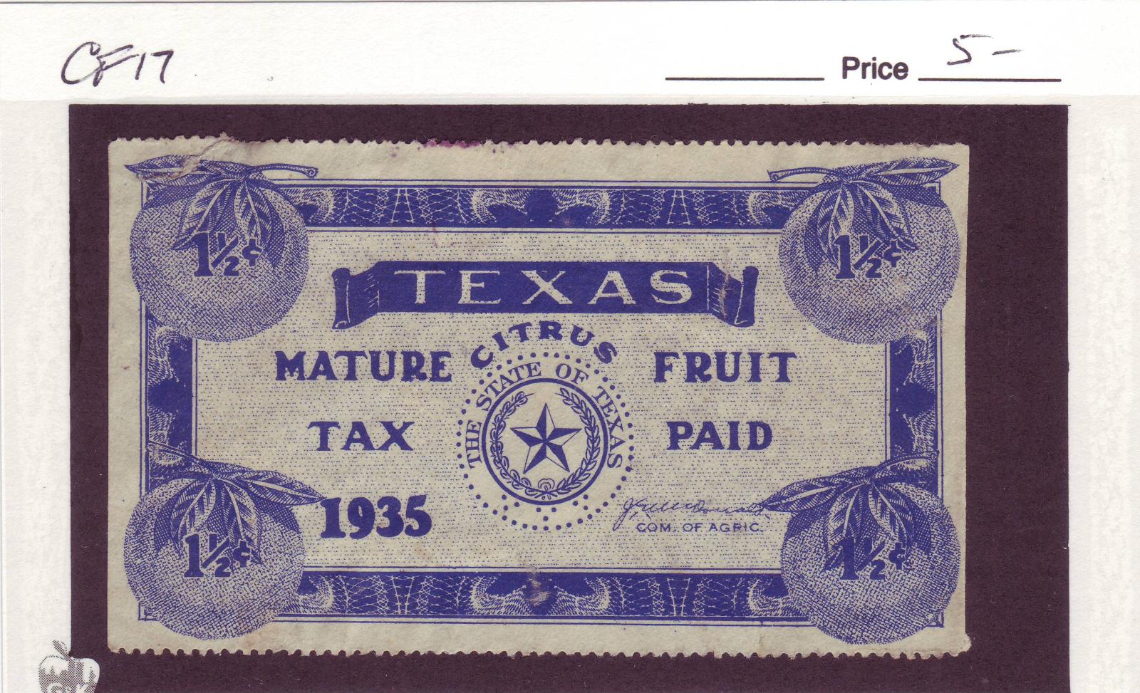 | Texas: 1935 1 1/2c Mature Fruit Tax Stamp, #CF17. | Price: $5.00