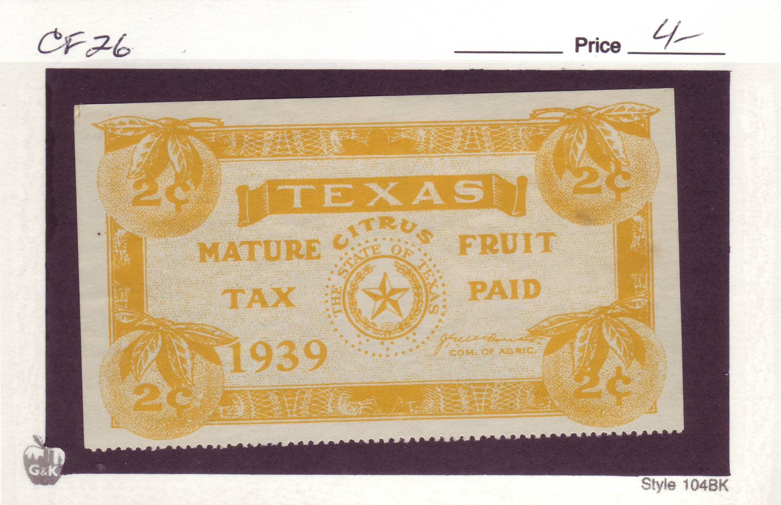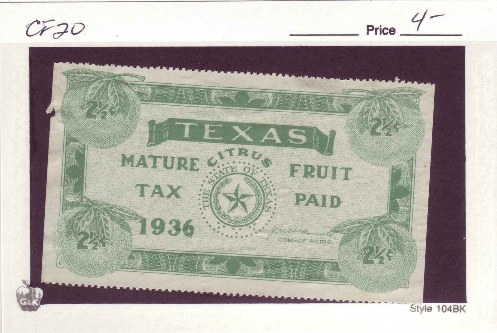 | Texas: 1936 2 1/2c Mature Fruit Tax Stamp, #CF20. | Price: $4.00