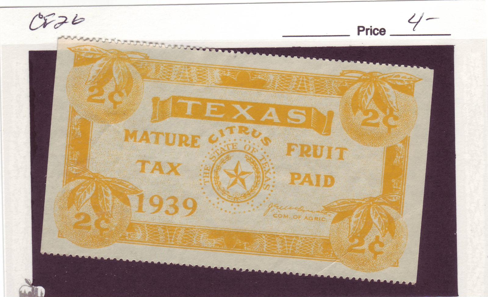 | Texas: 1939 2c Mature Fruit Tax Stamp, #CF26. | Price: $4.00