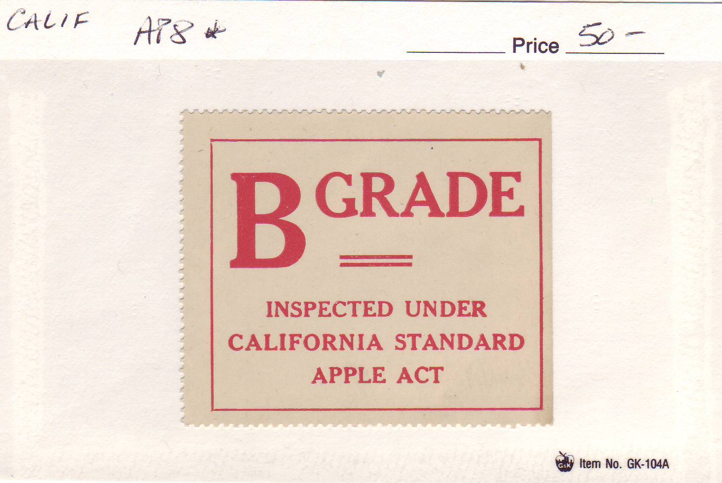 | California: Apple Tax Stamp, Grade B, #AP8, MH. | Price: $50.00