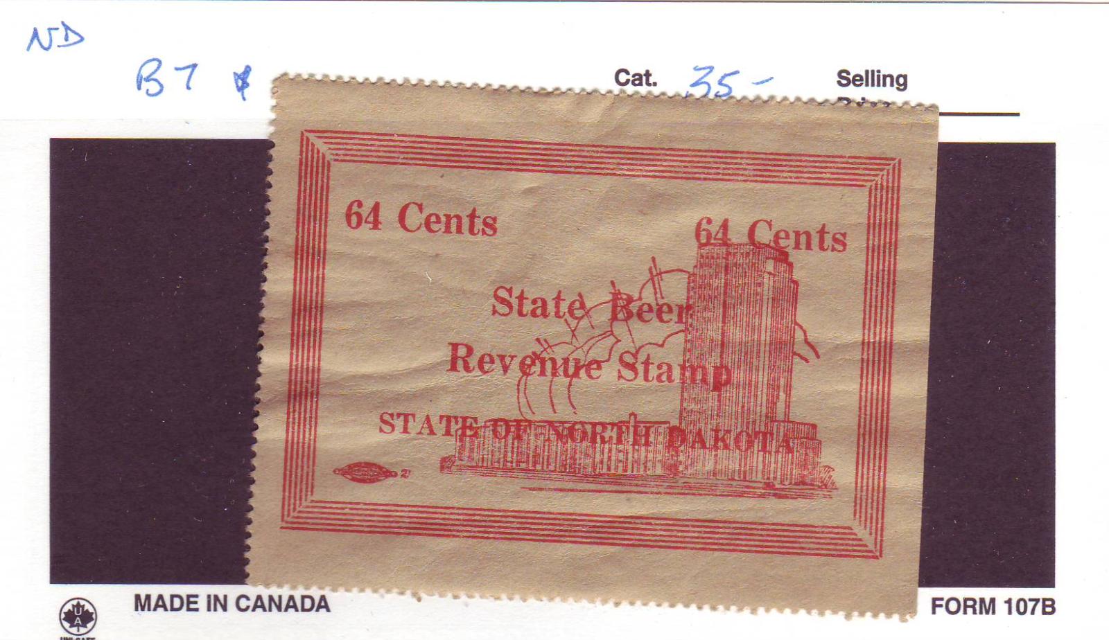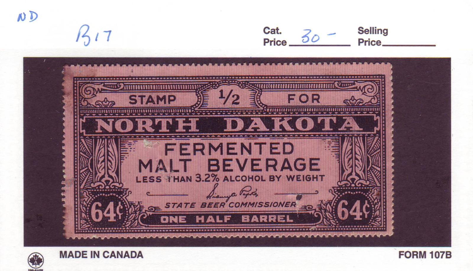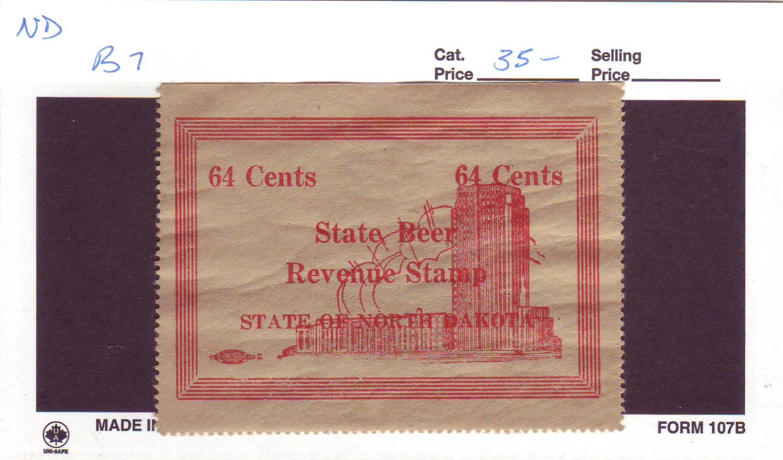 | North Dakota: 64c Beer Tax Stamp, B7. | Price: $30.00