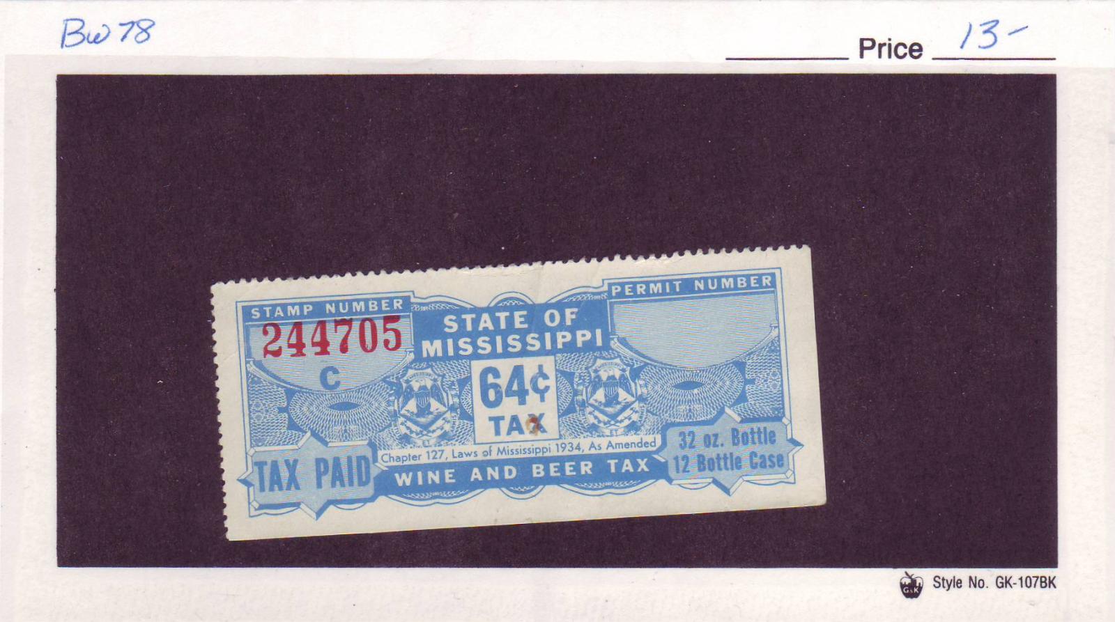 | Mississippi: 64c Wine $ Beer Tax Stamp, BW78. | Price: $13.00