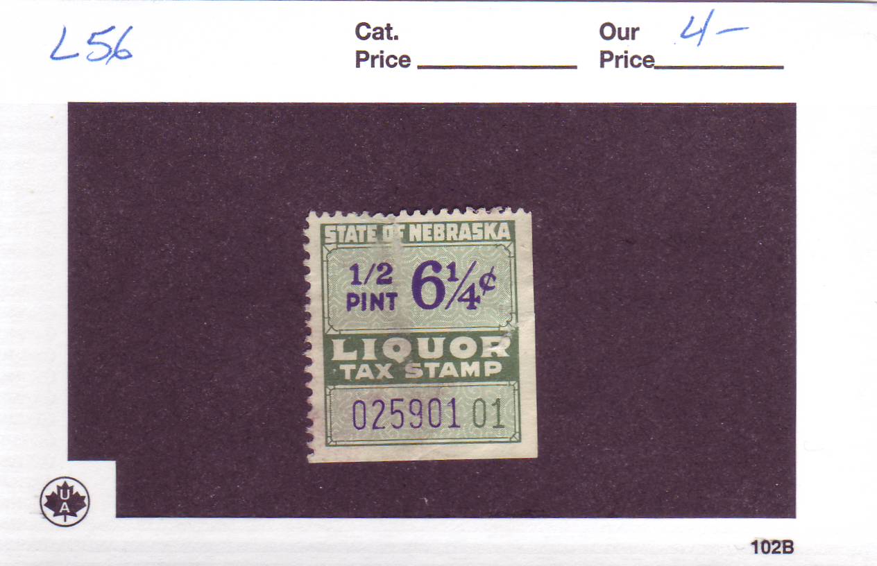 | Nebraska: 6 1/4c 1/2 Pint Liquor Tax Stamp, L56. | Price: $4.00