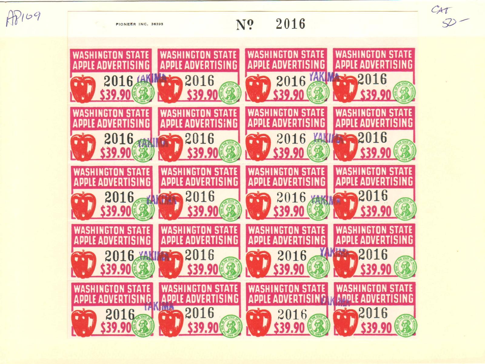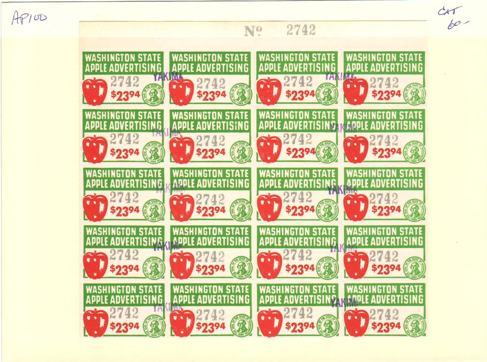 | Washington: $23.94 Apple Advertising Tax Stamp, Steet/20, #AP100. | Price: $35.00