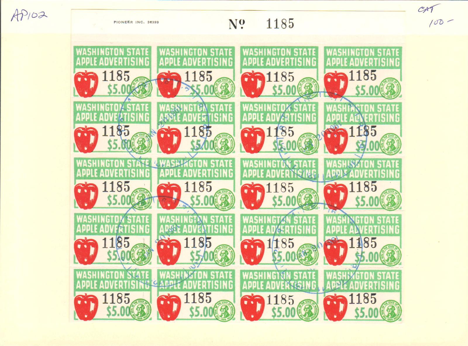 | Washington: $5.00 Apple Advertising Tax Stamp, Steet/20, #AP102. | Price: $55.00