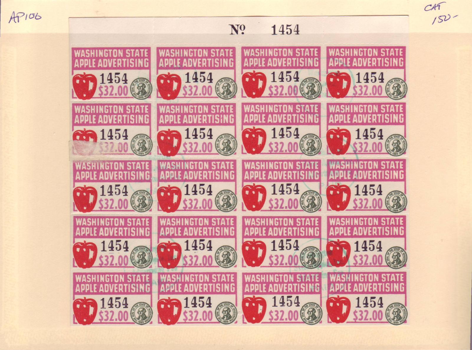 | Washington: $32.00 Apple Advertising Tax Stamp, Steet/20, #AP106. | Price: $85.00