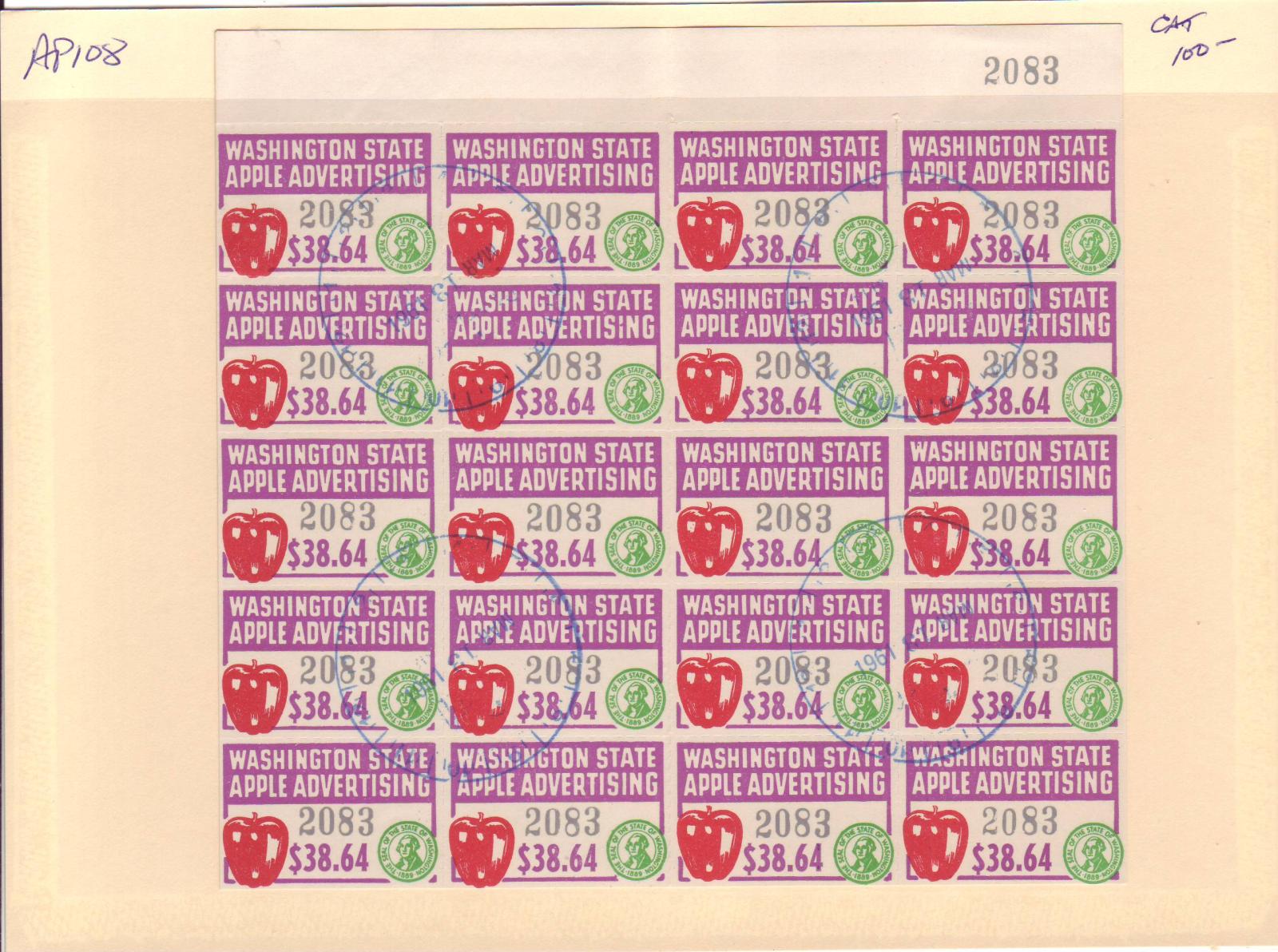 | Washington: $38.64 Apple Advertising Tax Stamp, Steet/20, #AP108. | Price: $55.00