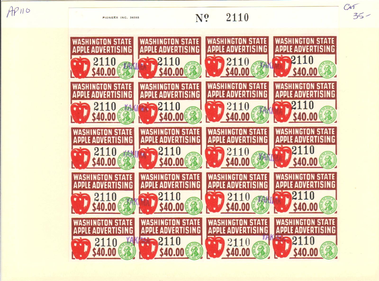 | Washington: $40.00 Apple Advertising Tax Stamp, Steet/20, #AP110. | Price: $20.00