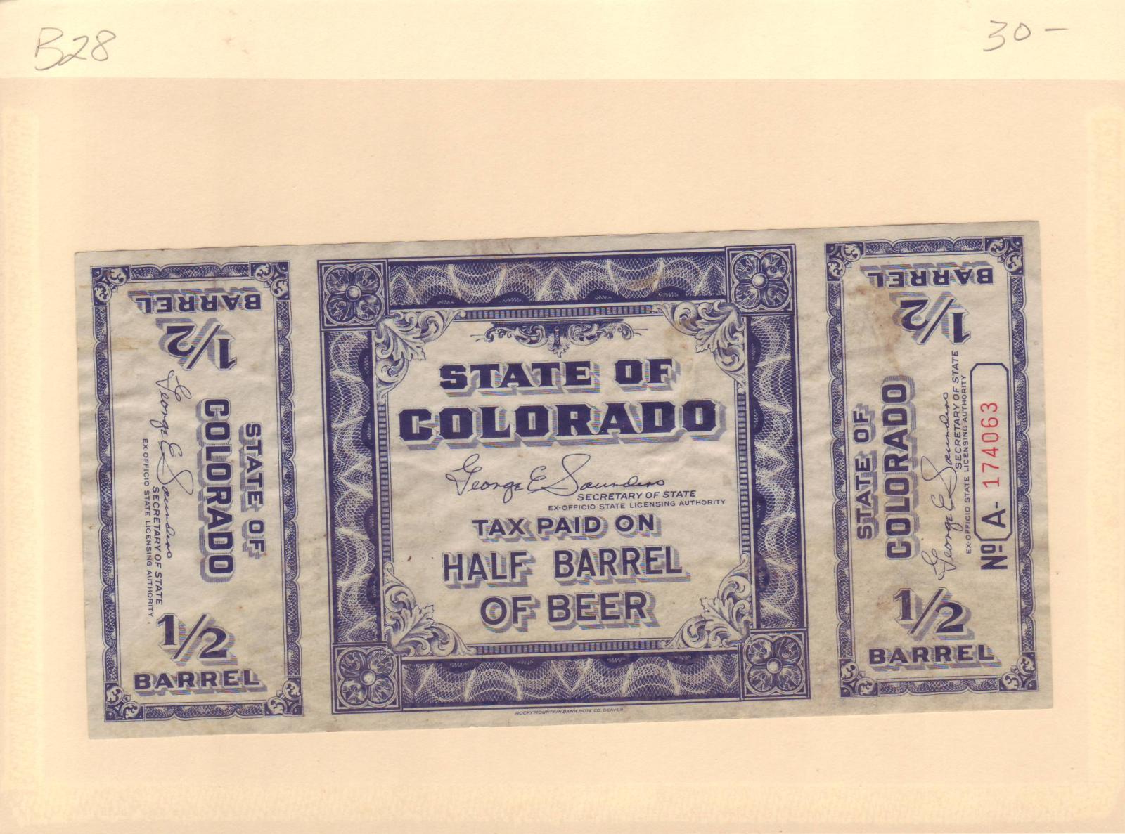 | Colorado: 1/2 Barrel Beer Tax Stamp, # B28. | Price: $30.00