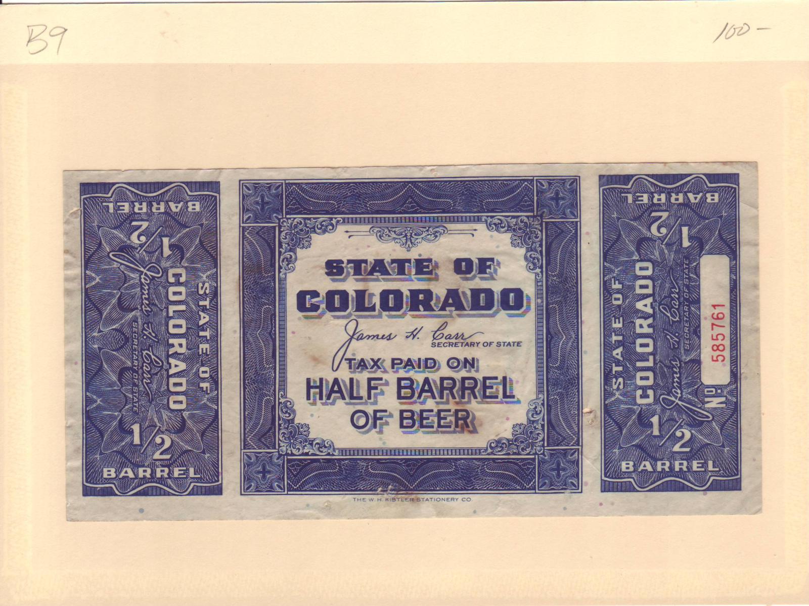 | Colorado: 1/2 Barrel Beer Tax Stamp, # B9. | Price: $100.00