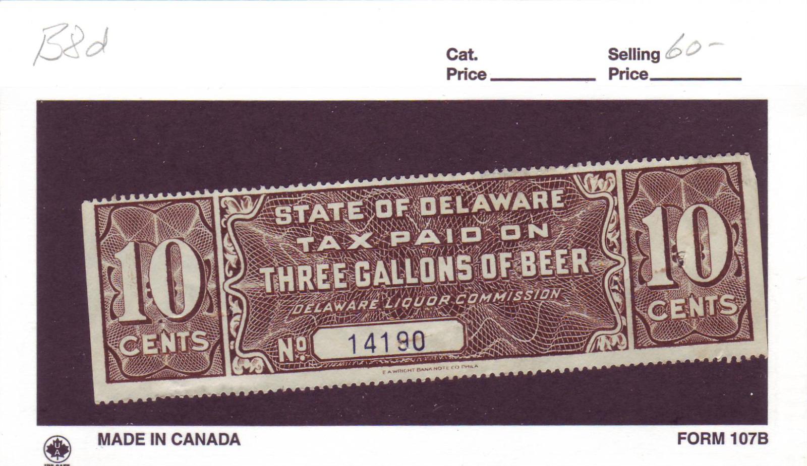 | Delaware: 3 Gal Beer Tax Stamp, #B8d. | Price: $60.00