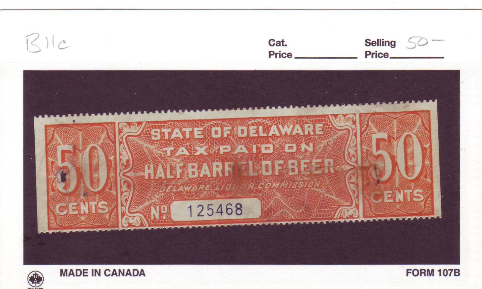 | Delaware: 1/2 Barrel Beer Tax Stamp, #B11c. | Price: $50.00