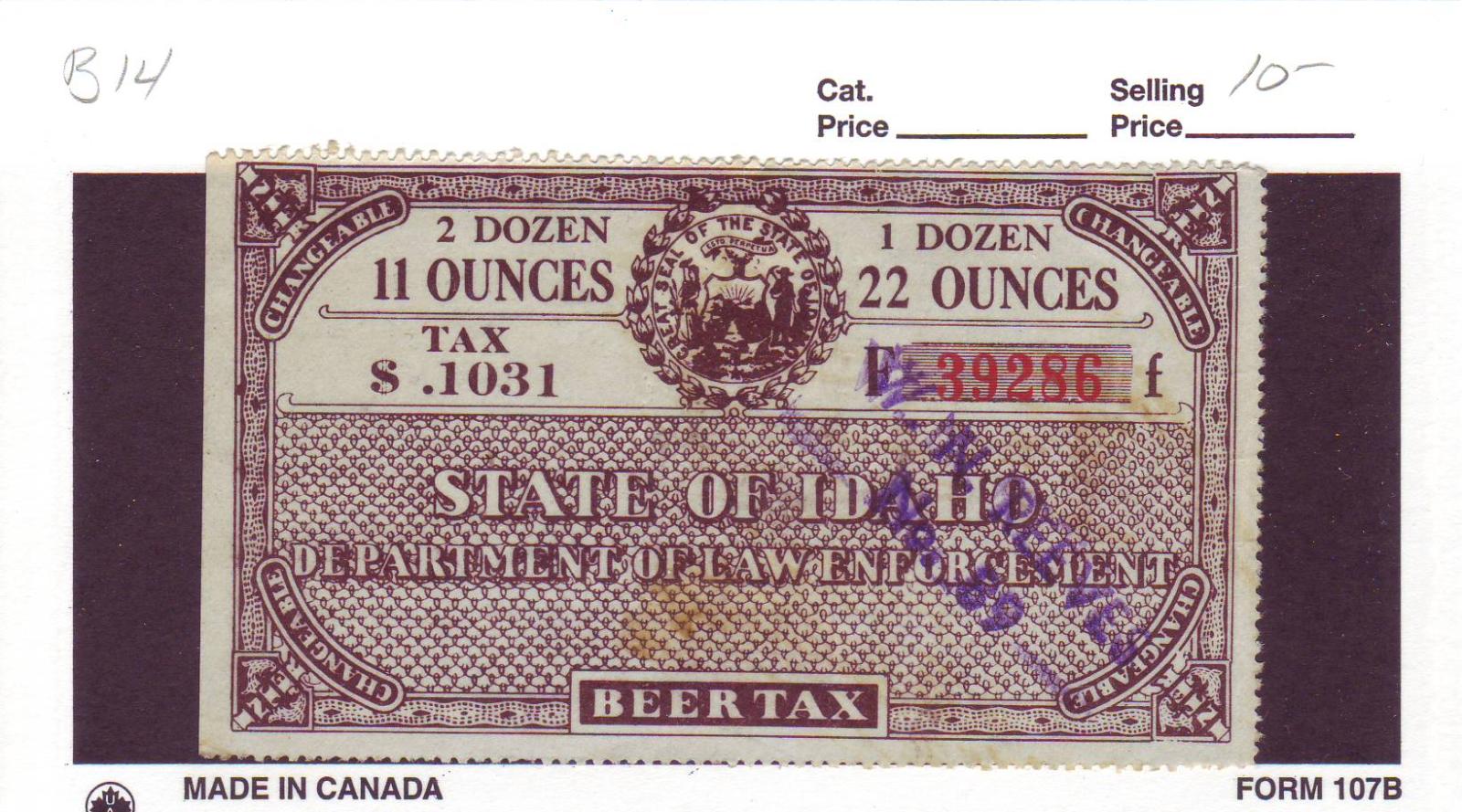 | Idaho: .1031c Beer Tax Stamp, #B14. | Price: $10.00