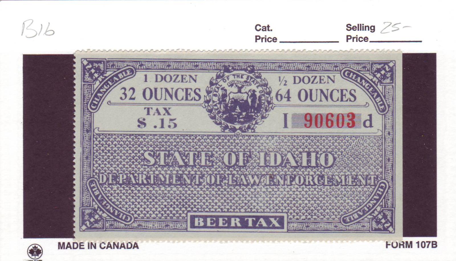 | Idaho: .15c Beer Tax Stamp, #B16. | Price: $25.00