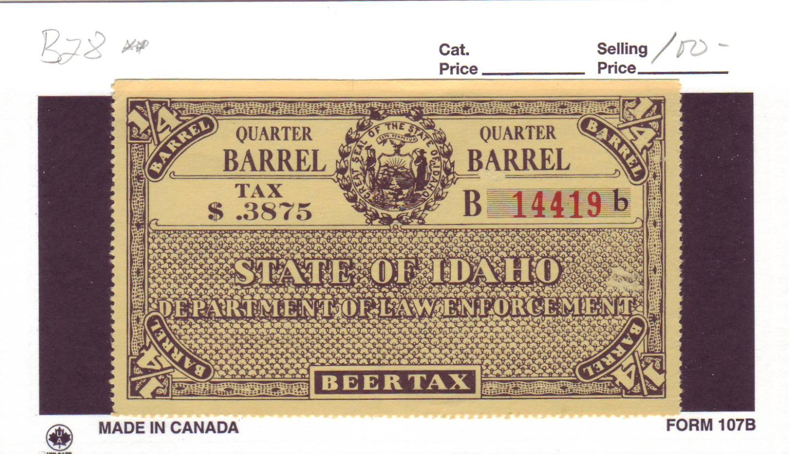 | Idaho: .3875c Beer Tax Stamp, #B28. | Price: $100.00