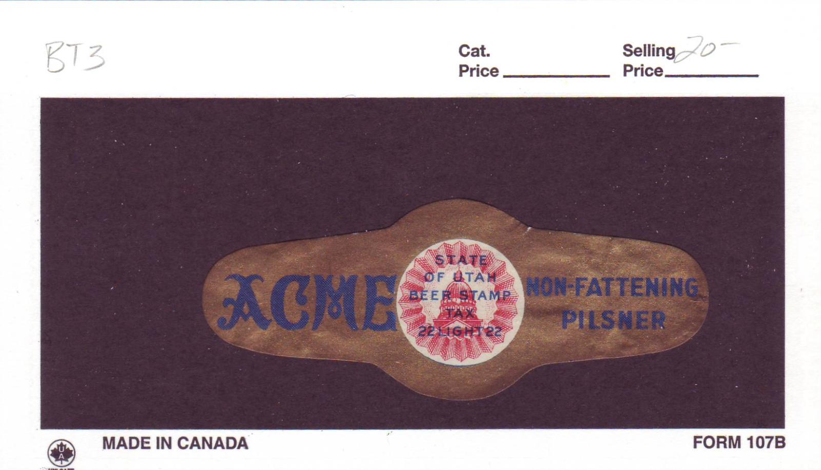 | Utah: Beer Tax Stamp, # BT3. | Price: $20.00