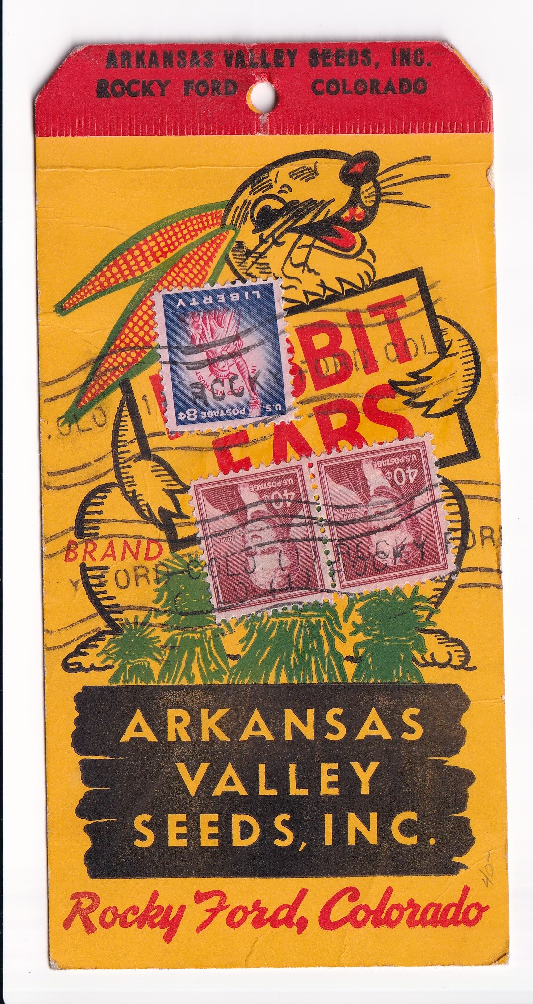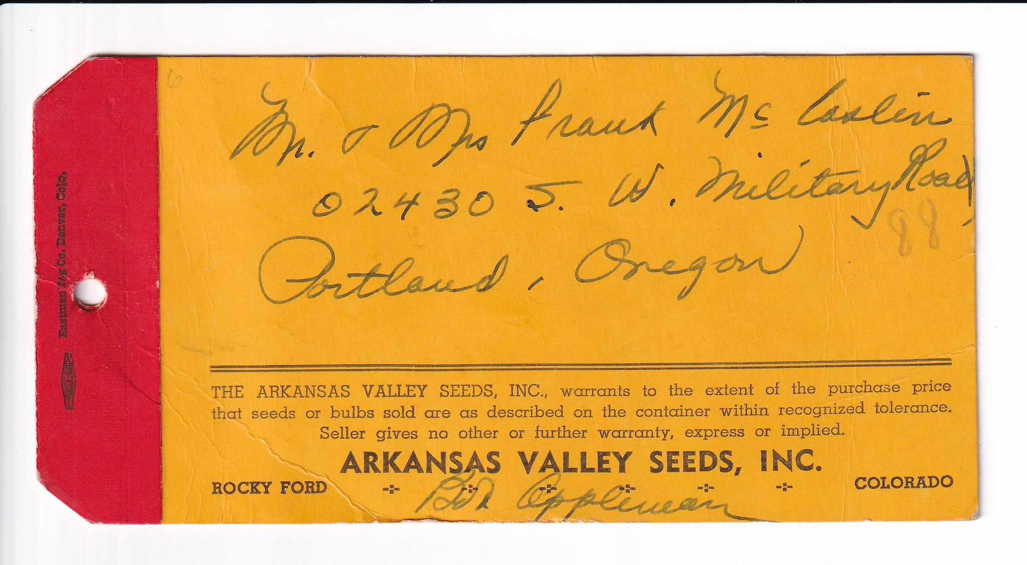 195x Rocky Ford, Co to Portland, Or Arkansa Valley Seed Co Shipping Tag w/Liberty Series.