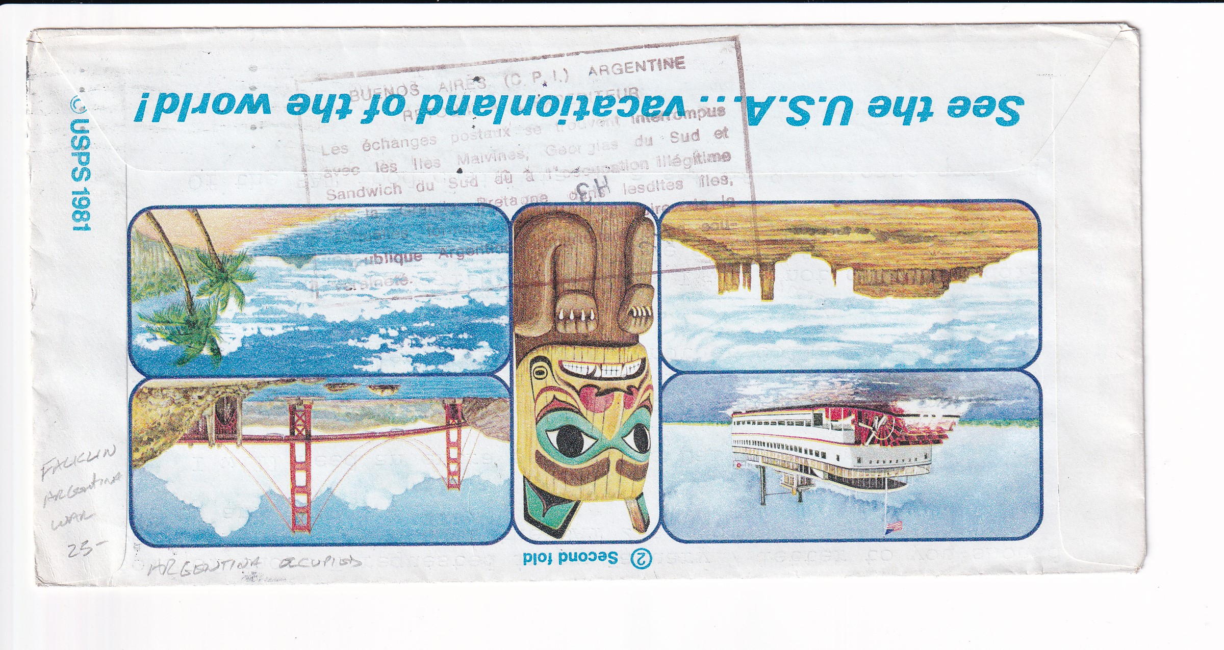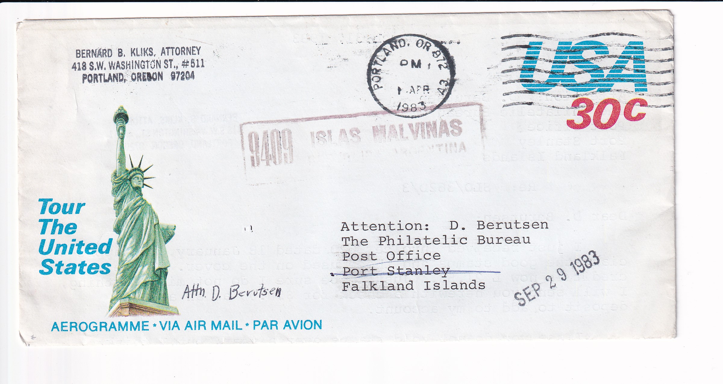 1983 Portland, Or to Port Stanley, Argentine Occupation of Falkland Islands 30c Airletter sheet. Falklands-Argentina War. Was received during the Occupation of the Falklands.